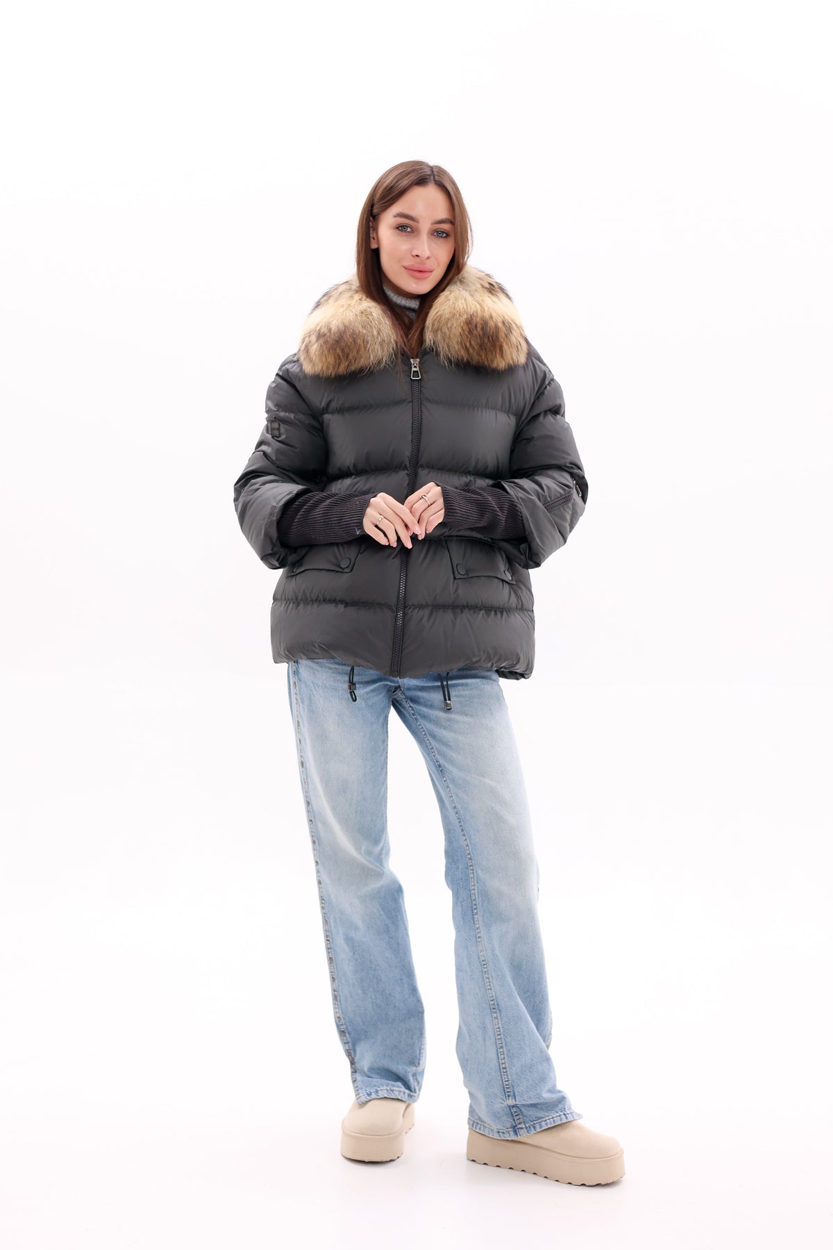 The genuine fur collar adds a touch of elegance and luxurious warmth, making it a perfect statement piece for colder days. Featuring a straight-cut silhouette, it provides a modern, flattering fit that suits any wardrobe. The long knitted cuffs not only enhance the design but also help seal in warmth, ensuring extra comfort in chilly weather.