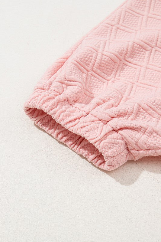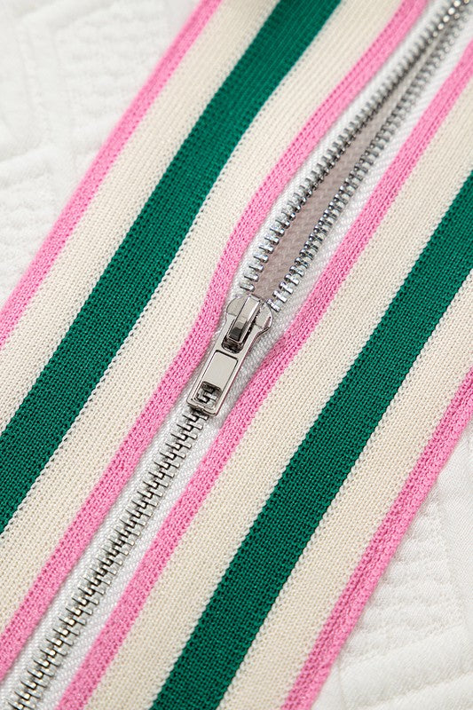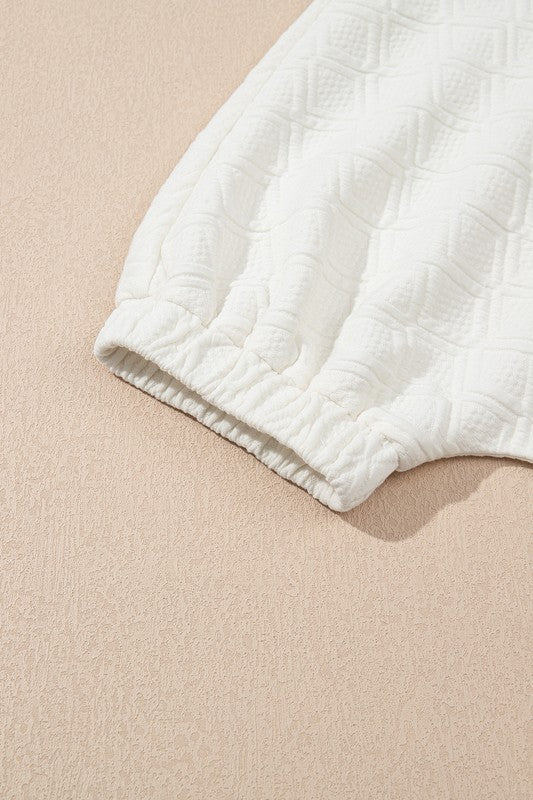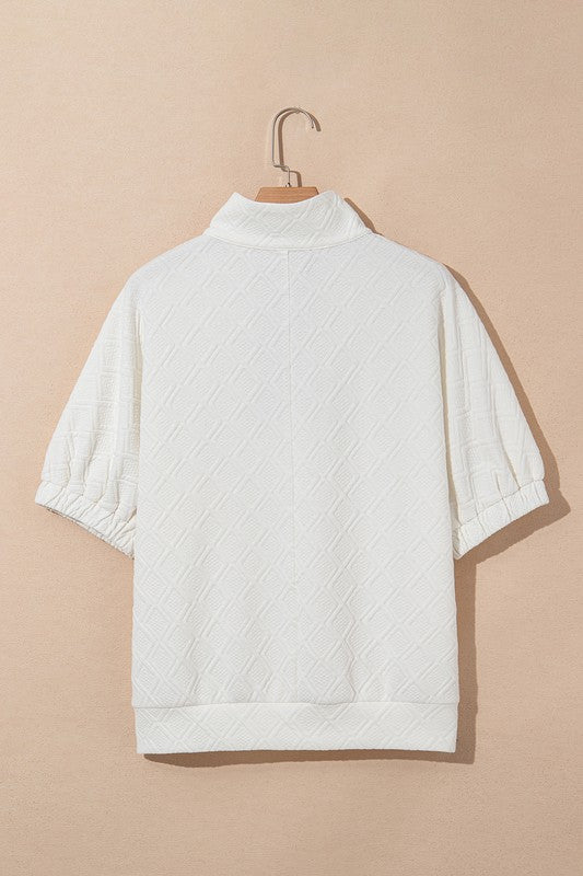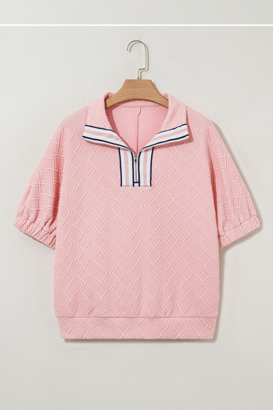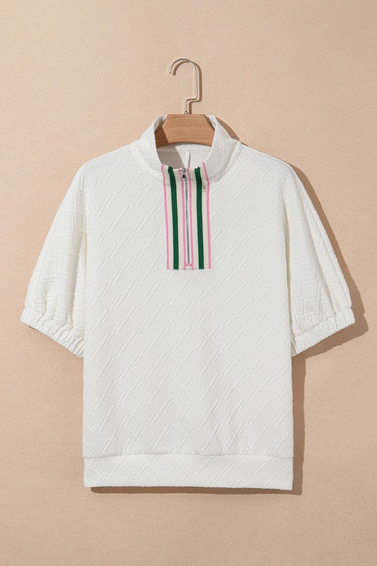 Colorblock Zipper Puff Sleeve Textured Blouse