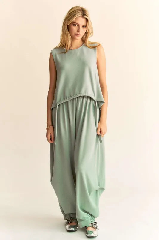 The drawstring hem round neck tank and pants set is a stylish and comfortable outfit that includes a sleeveless top with a round neckline and a drawstring detail at the hem for a customizable fit. This set is perfect for casual wear, lounging, or active days, offering a trendy look with practical design elements. It's a versatile ensemble that combines fashion and functionality effortlessly.