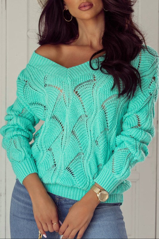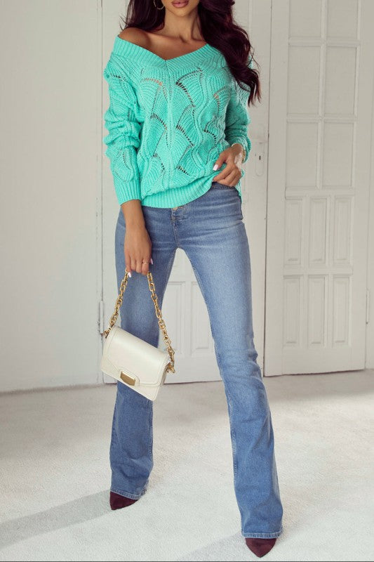 This knit sweater combines expert tailoring with soft, breathable fabric for a refined look. Its neckline design adds subtle sophistication, while the drop shoulder design offers relaxed comfort. Perfectly suited for pairing with jeans or skirts, this solid-color piece effortlessly enhances any wardrobe with timeless elegance. Acrylic/Poly/Wool