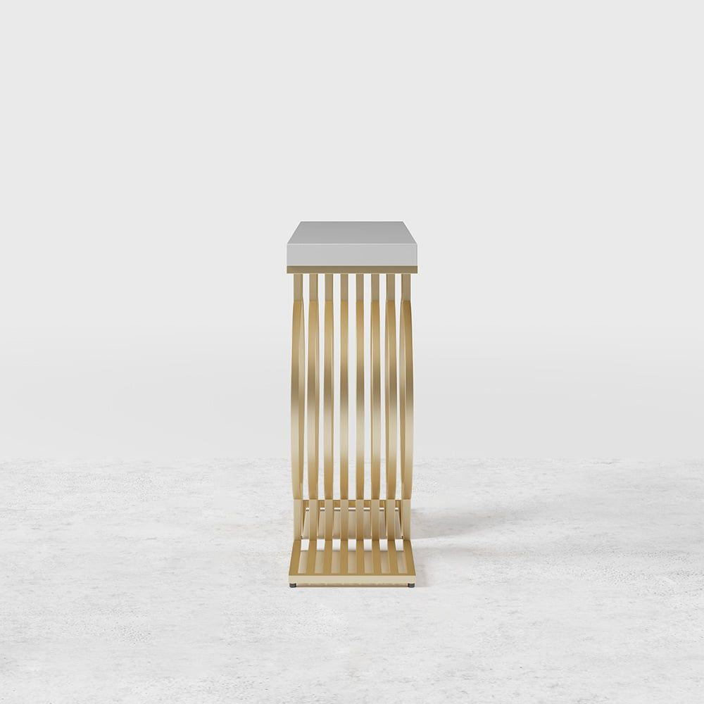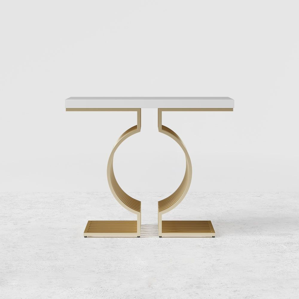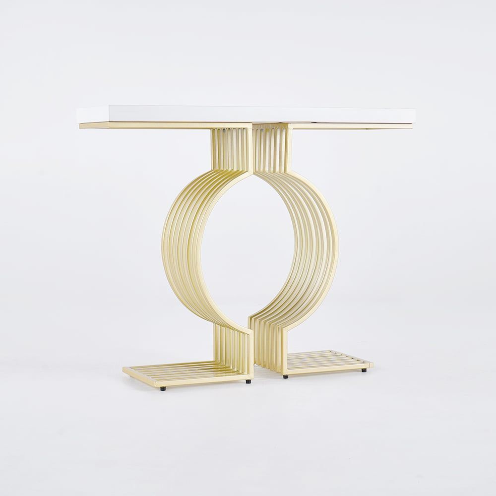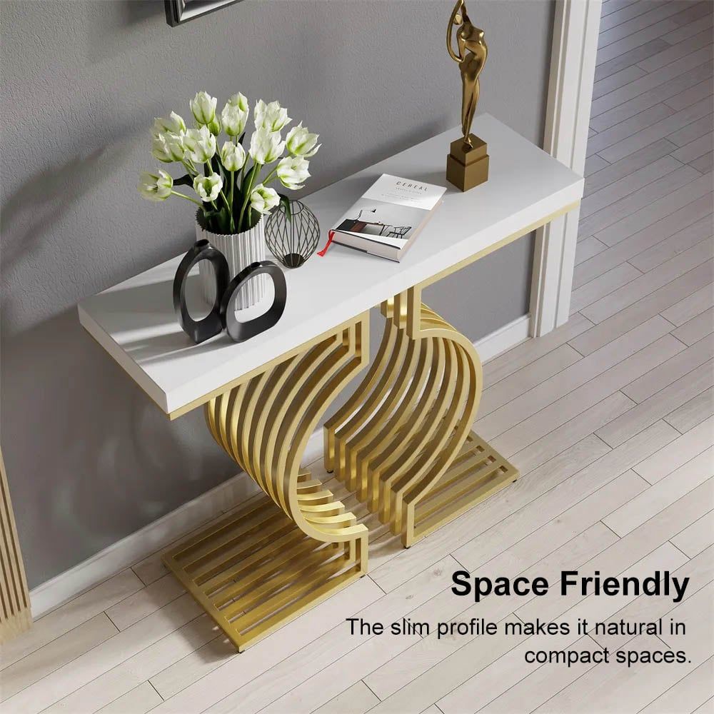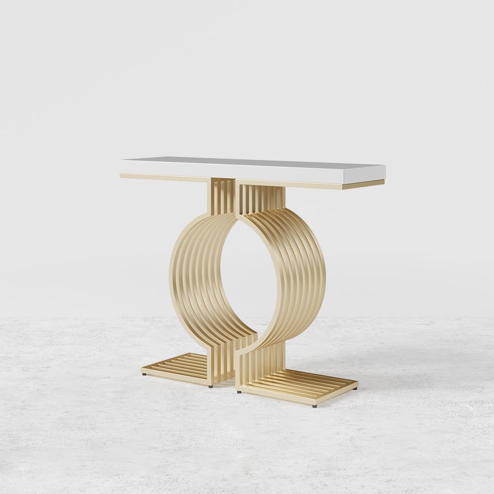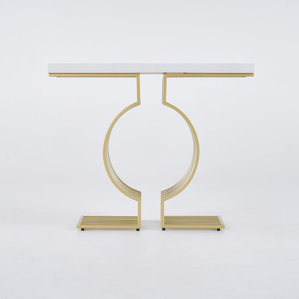 Upgrade your space with this modern console table featuring a sleek white top and a geometric gold base. Made from high-quality materials, it's perfect for entryways, hallways, or living rooms. Easy to assemble with detailed instructions included.
