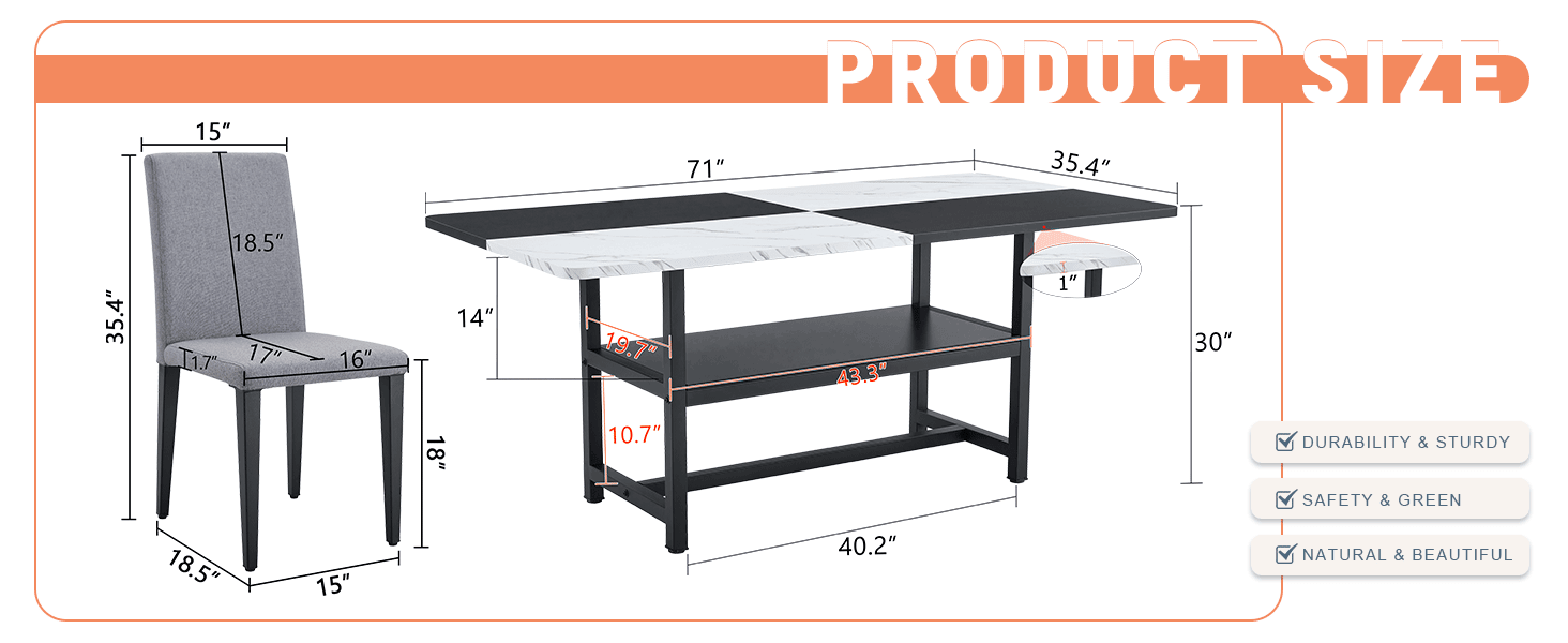 Size adaptation: This dining table measures 71 inches in length, 35.4 inches in width, and 30 inches in height. With its grand specifications, it can easily accommodate multiple people dining at the same time, making it perfect for both family gatherings and friend parties.