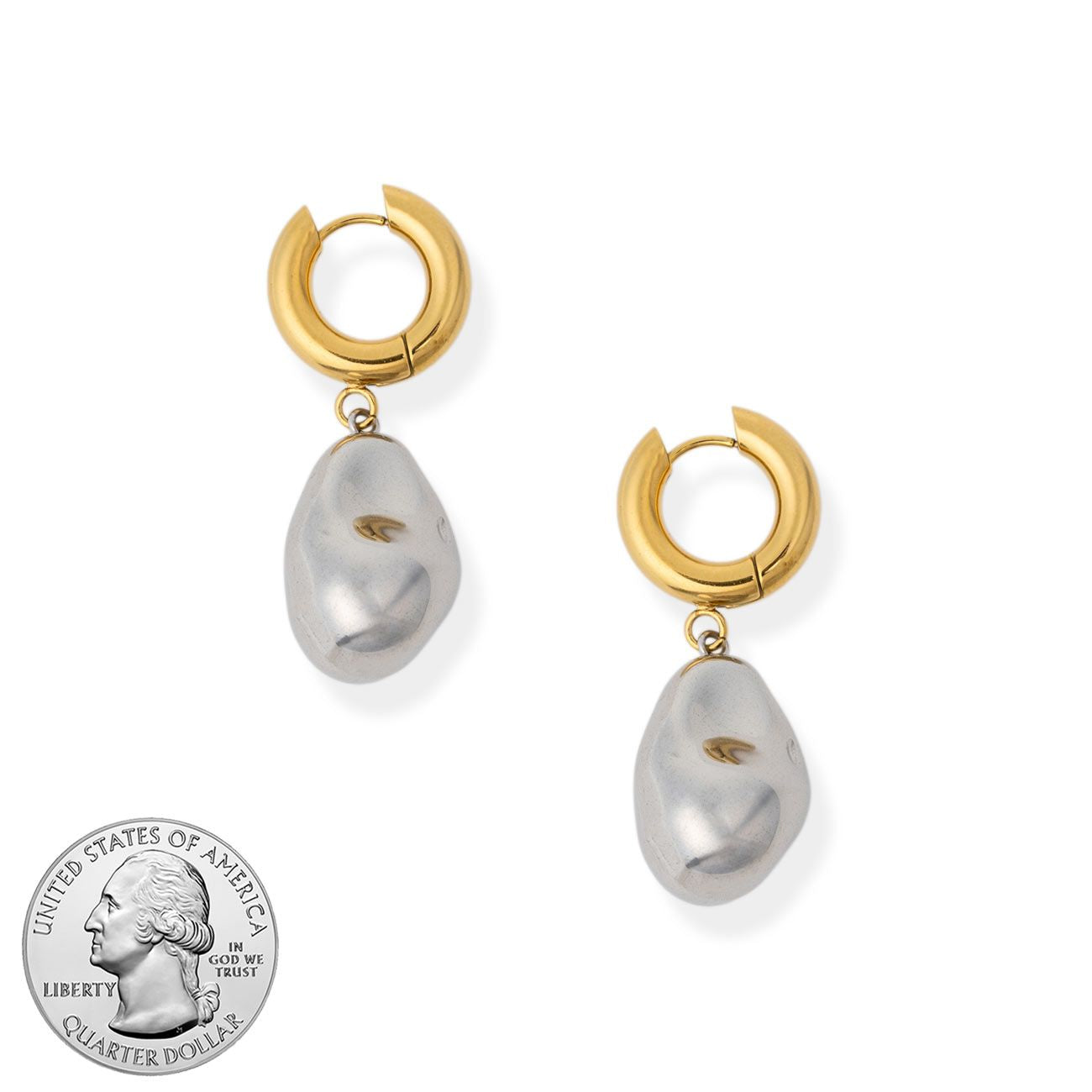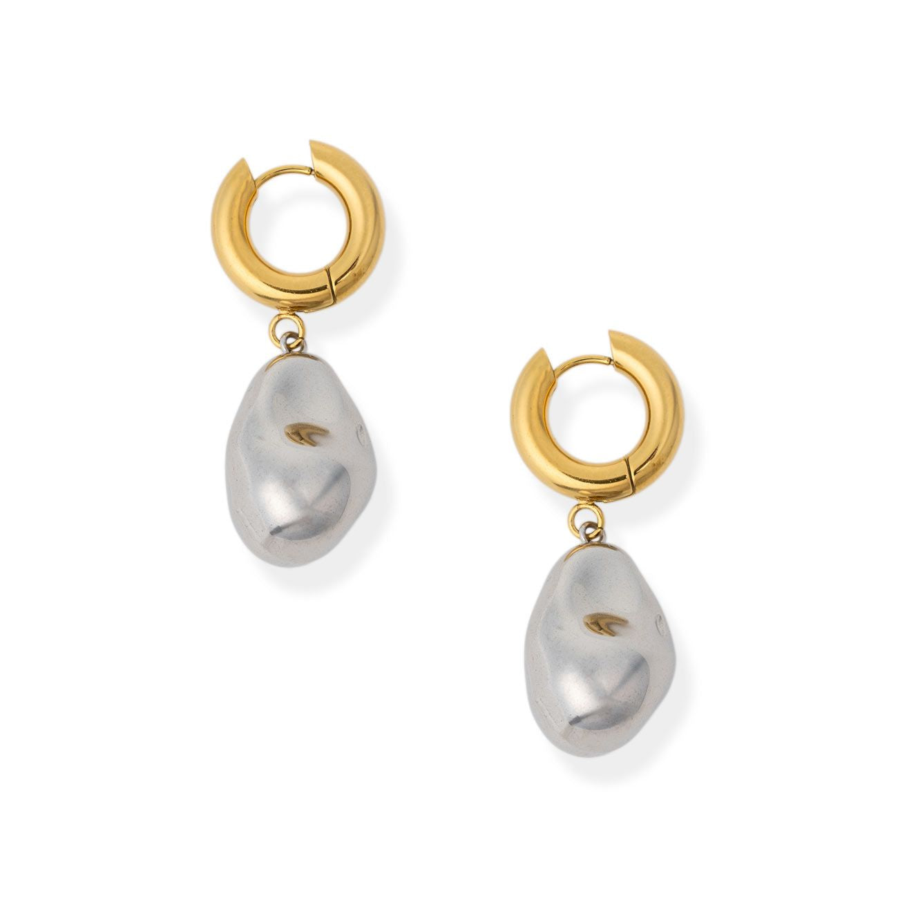 The Knox Droplet earrings combine silver and gold tones in a single design, offering a distinctive accessory that complements any look. Featuring a silver free-form droplet pendant and a gold hoop.
