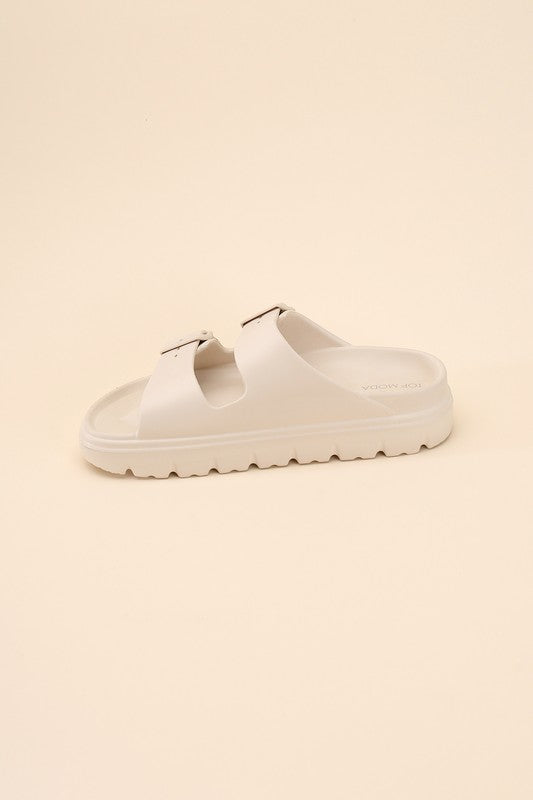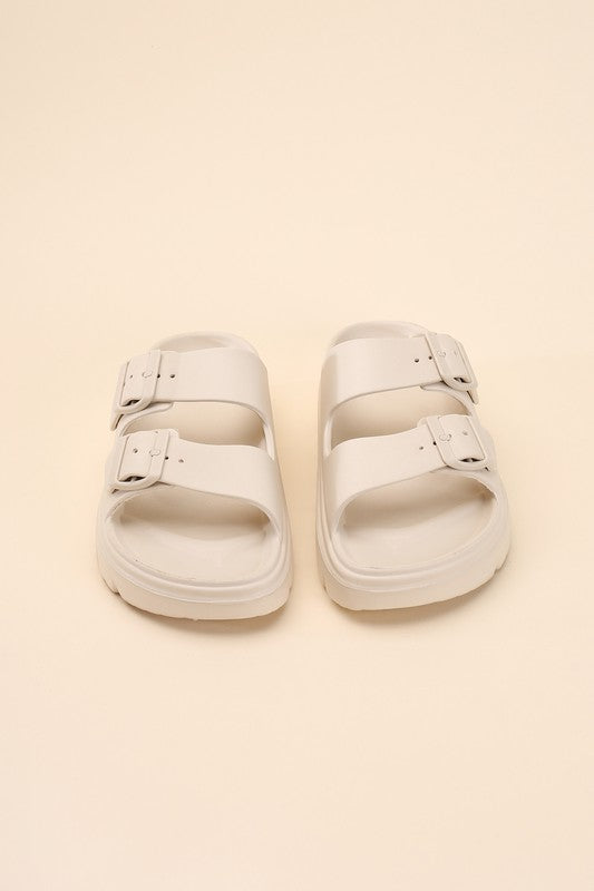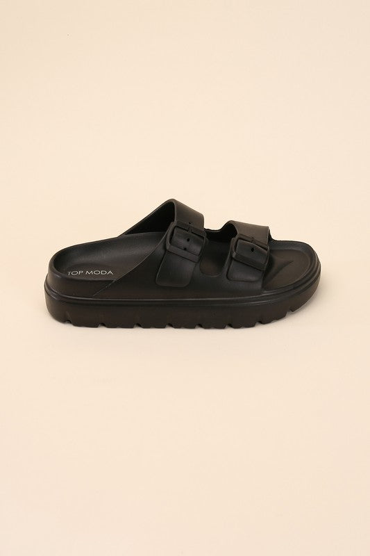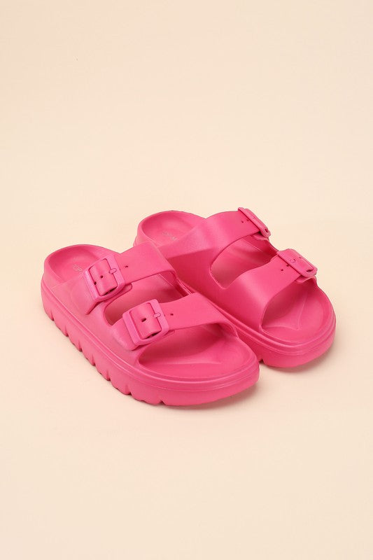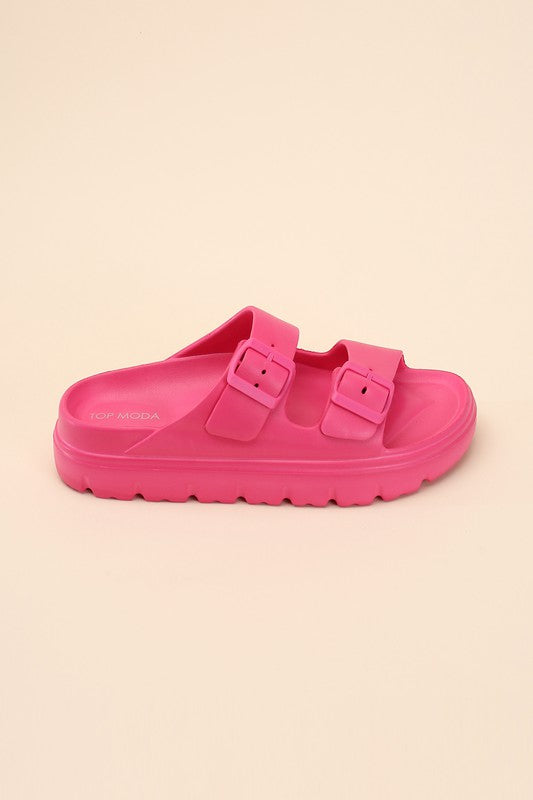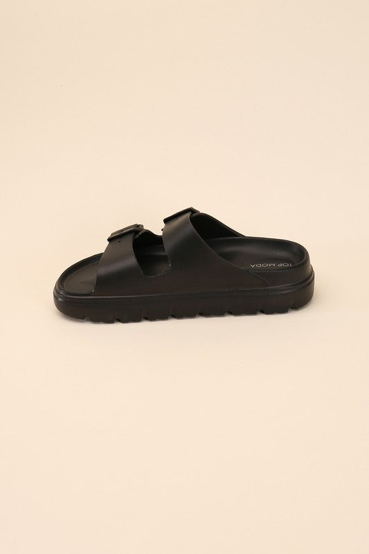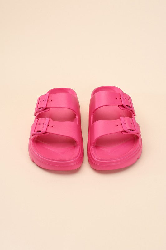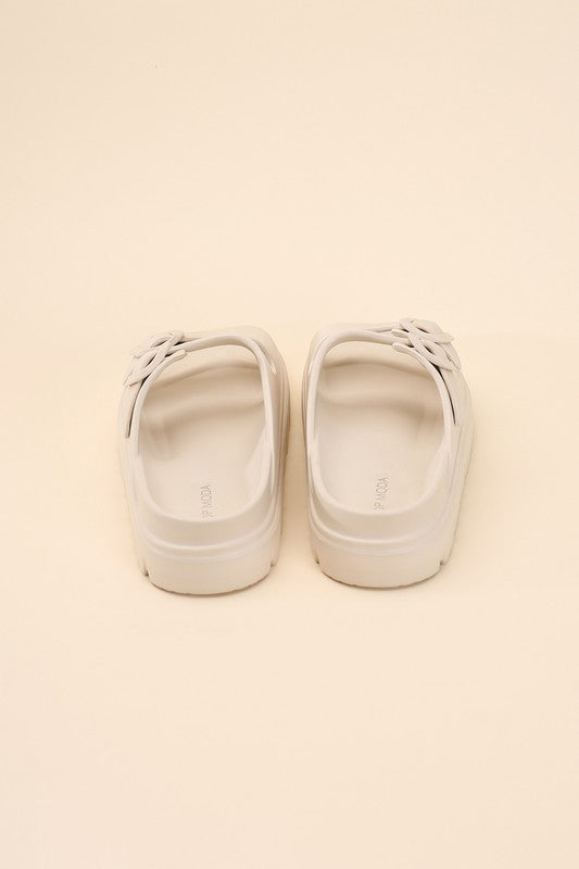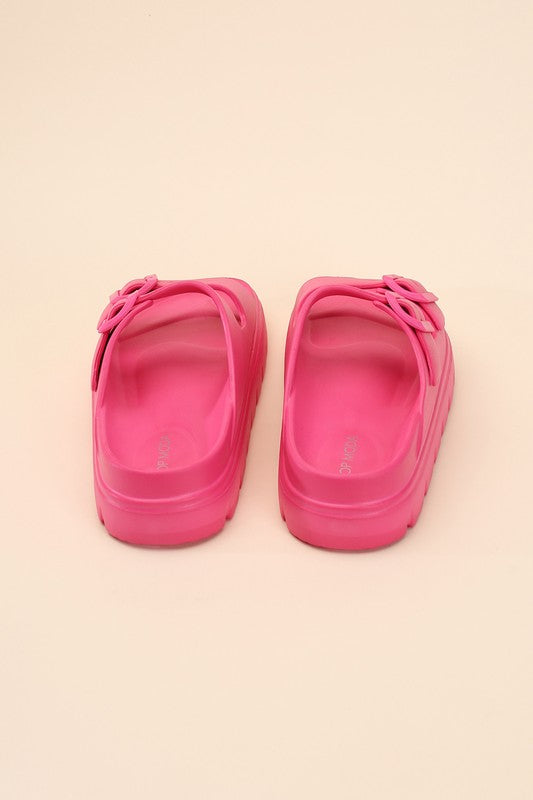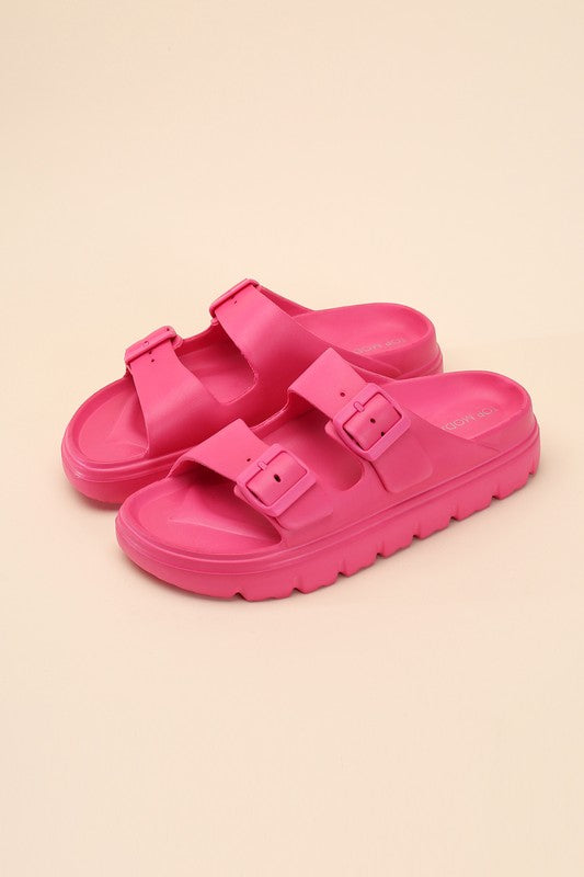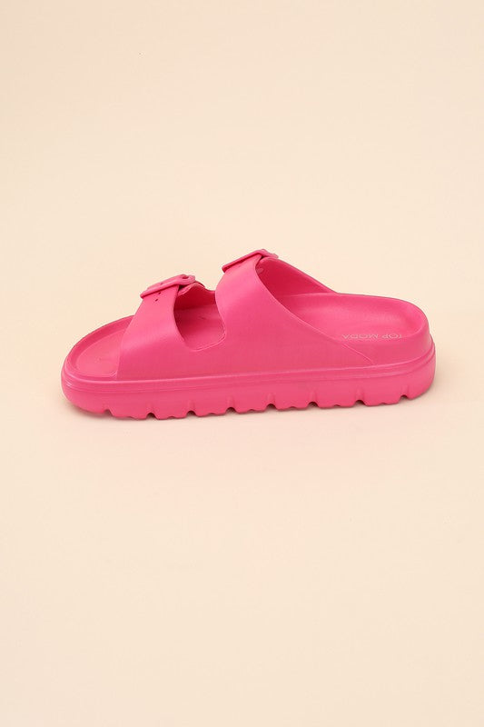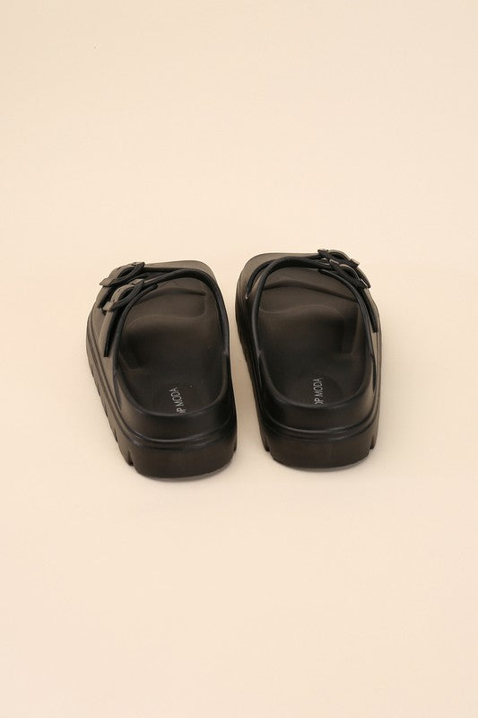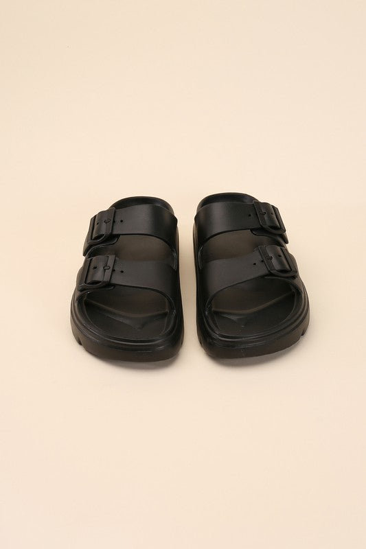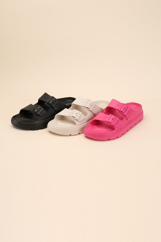A sleek and versatile addition to your footwear collection. These slides feature a buckle strap design that adds a touch of modern style to your look. The slip-on style ensures convenience, making them perfect for easy on-the-go wear.