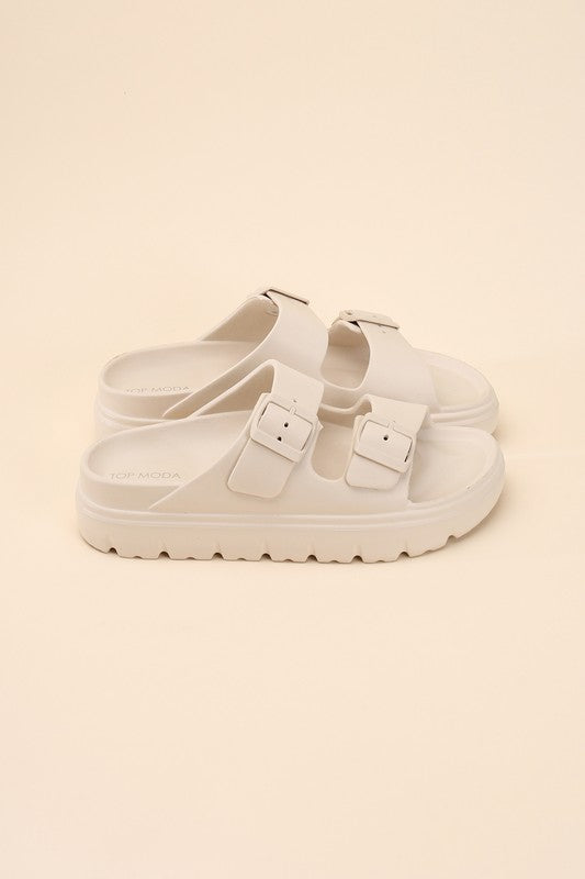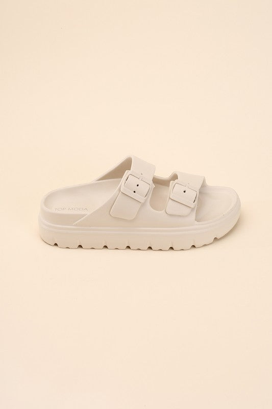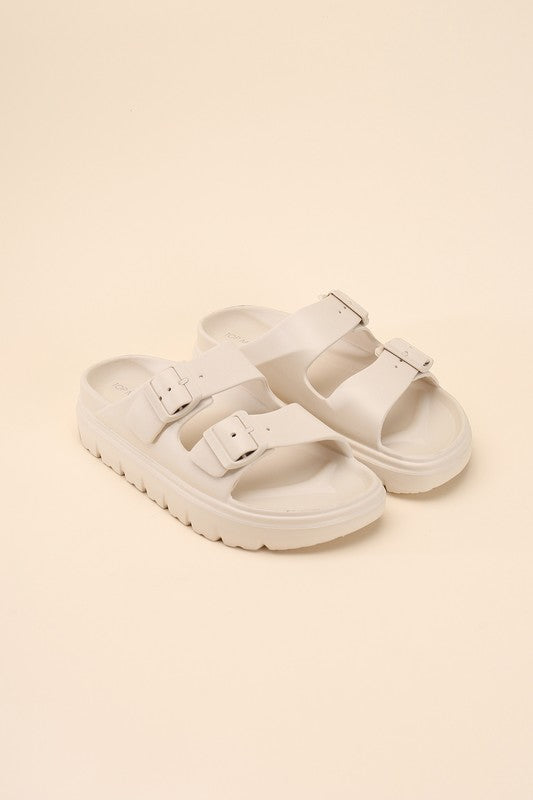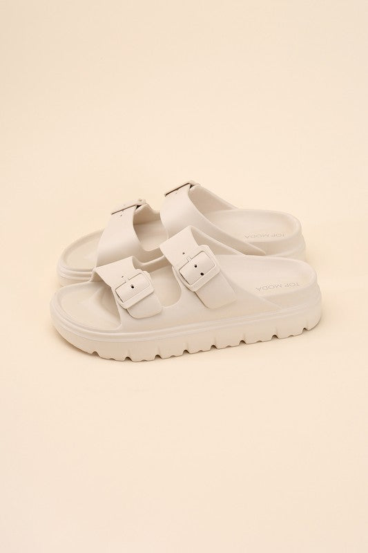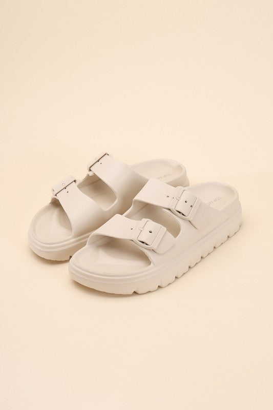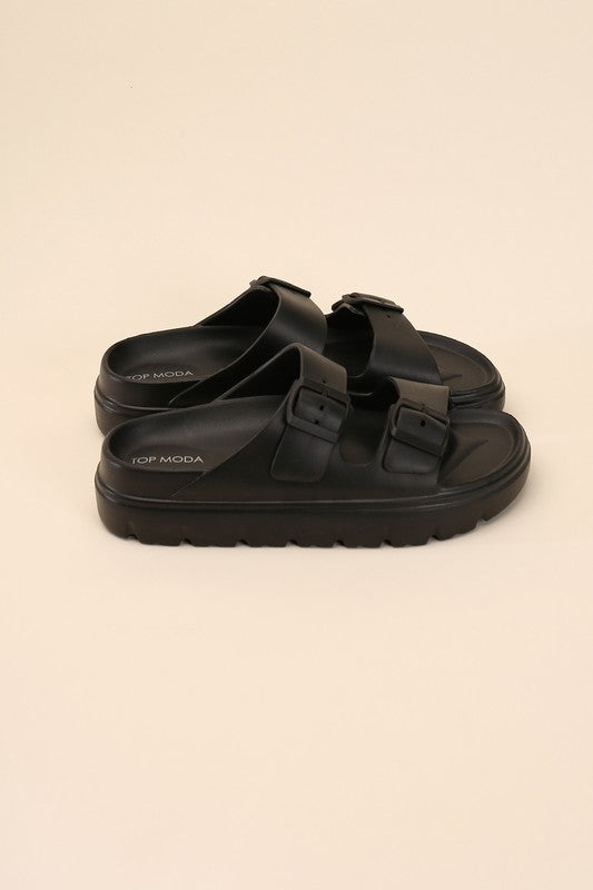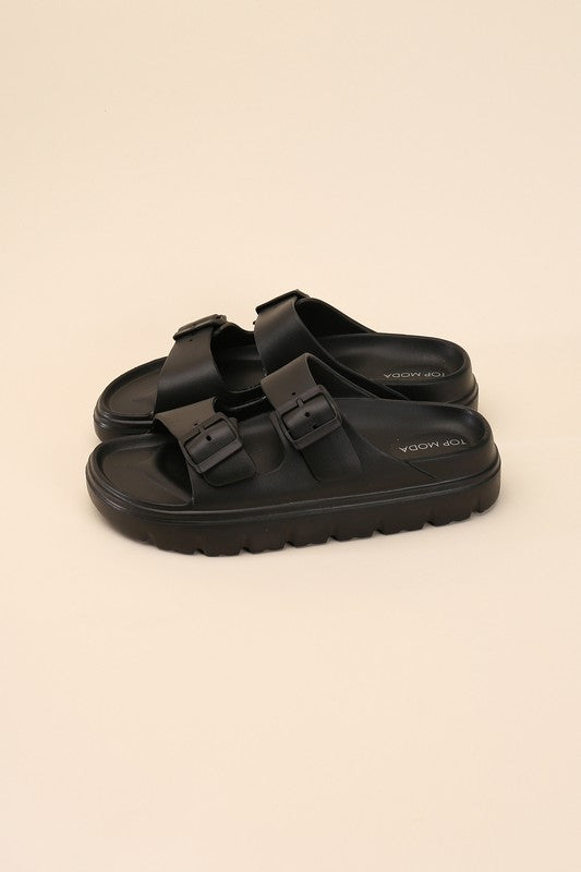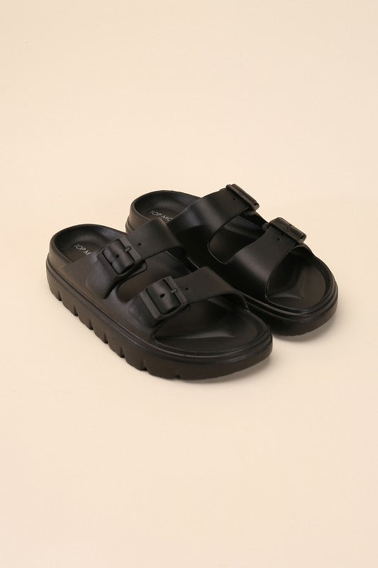Buckle strap slides Toe: Open toe, round Heel shape: Flat Material: Synthetic Imported. Made in China