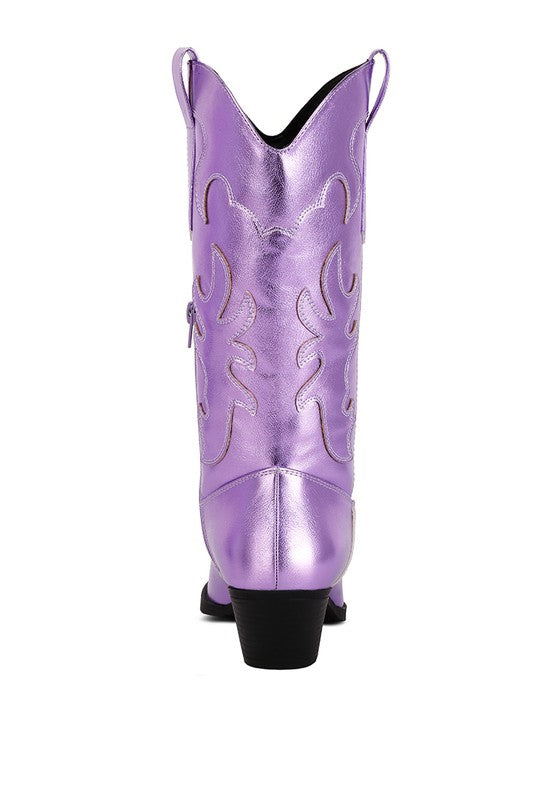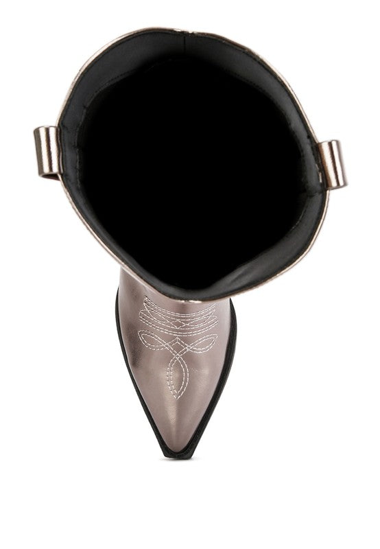 These boots combine style and comfort seamlessly. Crafted in metallic faux leather, they shine with elegance. With a convenient slip-on design and pull tabs, these boots are both fashionable and practical. Embroidered stitch details enhance the boots' appeal, making them perfect for upcoming music festivals and concerts.