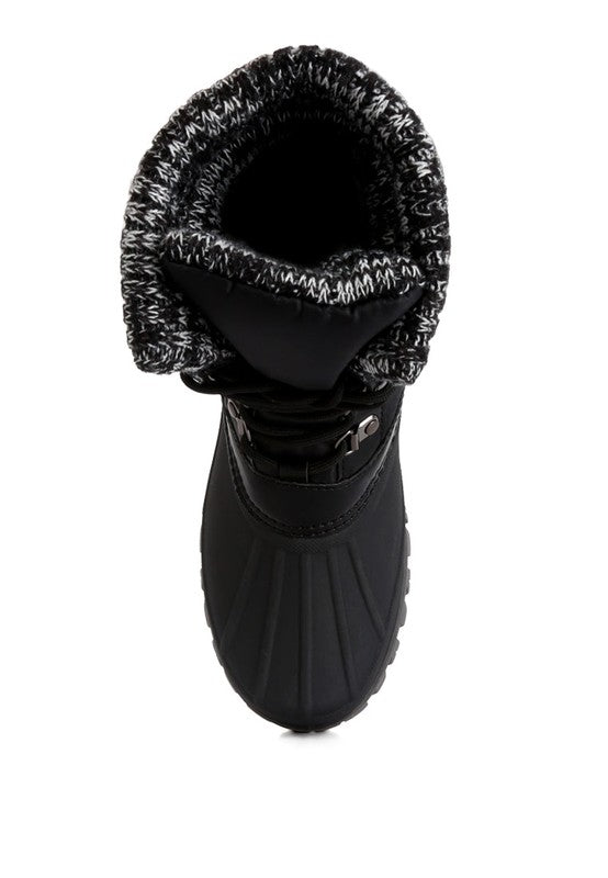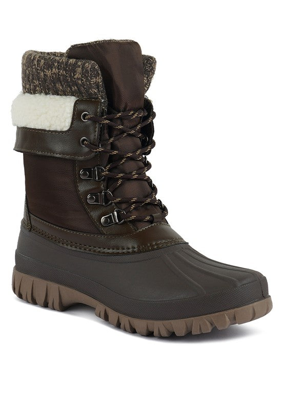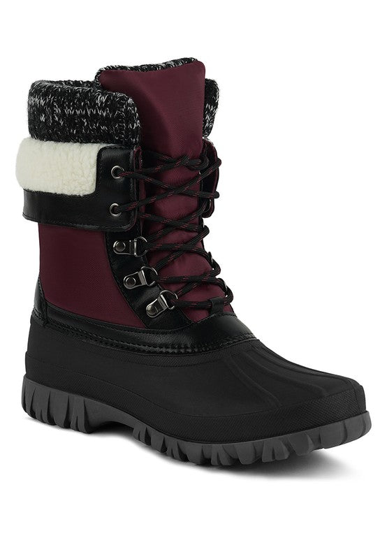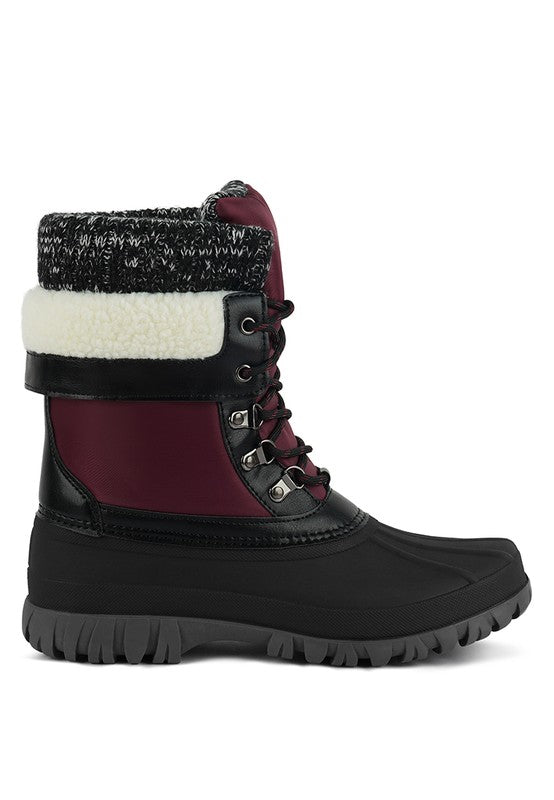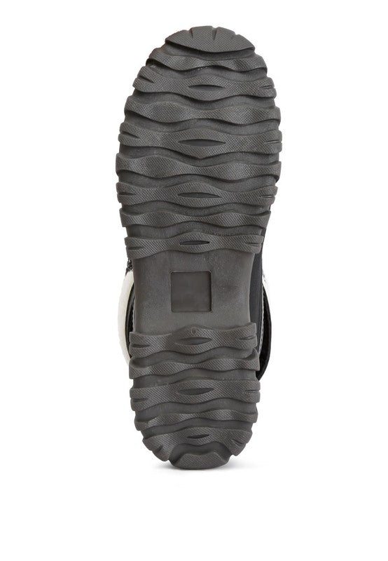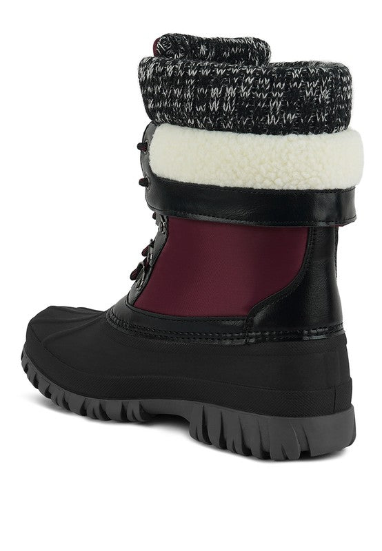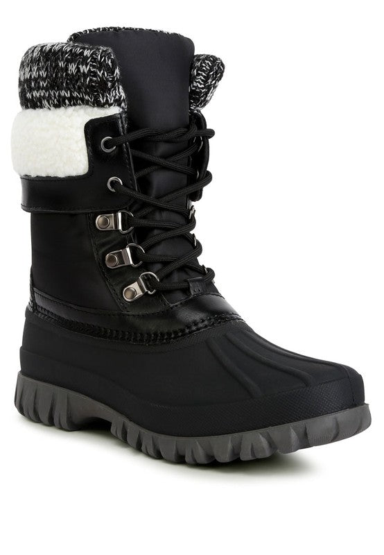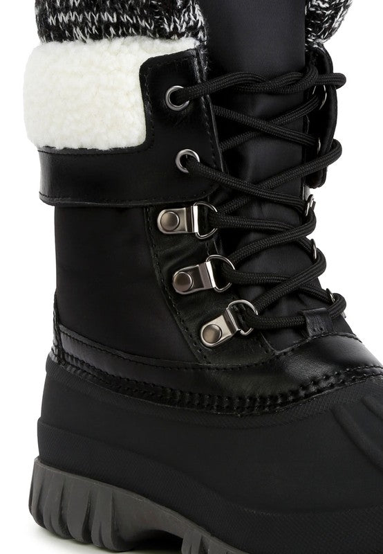This pair of boots comes with an ankle length sturdy structure, and rubber sole. It also comes with a lace up closure which resembles a bungee cord rope, and the laces are secured with utility metallic eyelets. The collar and tongue of the boots feature an extended knitted detail and shearling lining right below it.