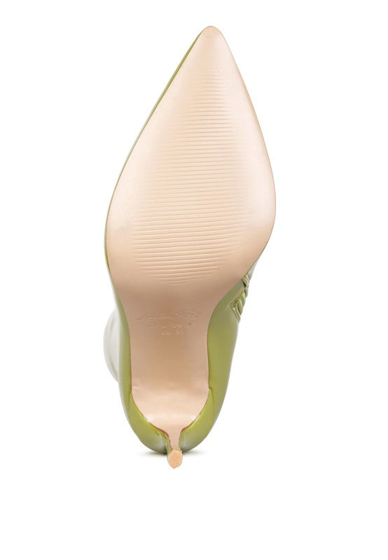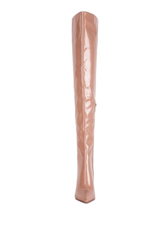 Outer material: Stretch Patent PU Lining Material: Synthetic Outer sole: TPR Closed Pointed Toe Stiletto Heel Boot Back and Side Zipper Opening Stretch Patent PU Boot SH3346