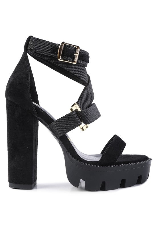 Fierce and fashionable, the harness straps running across the feet is all attention seeker and has shining gold buckles which are a subtle luxurious element. The platform heels are high and chunky. The innersole is cushion padding that cuts stress.