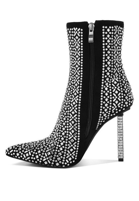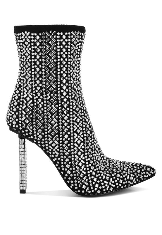 Opulent, indulgent, luxurious- meet your new ankle-length stiletto boots. They have a soft microfiber upper and patterned rhinestone embellishment. With a side zipper fastening and 4.5-inch rhinestone-studded stiletto heel, these party boots are one pair that will soon turn into your price possession.