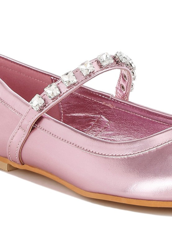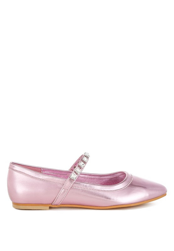 The luxurious metallic pleather Mary Jane ballerinas are a must-have addition to your wardrobe. With a classic diamante-embsllished strap, plush cushioned insoles, and flat heels, these shoes are as comfortable as they are stylish. Their versatile silhouette makes them easy to pair with any outfit!
