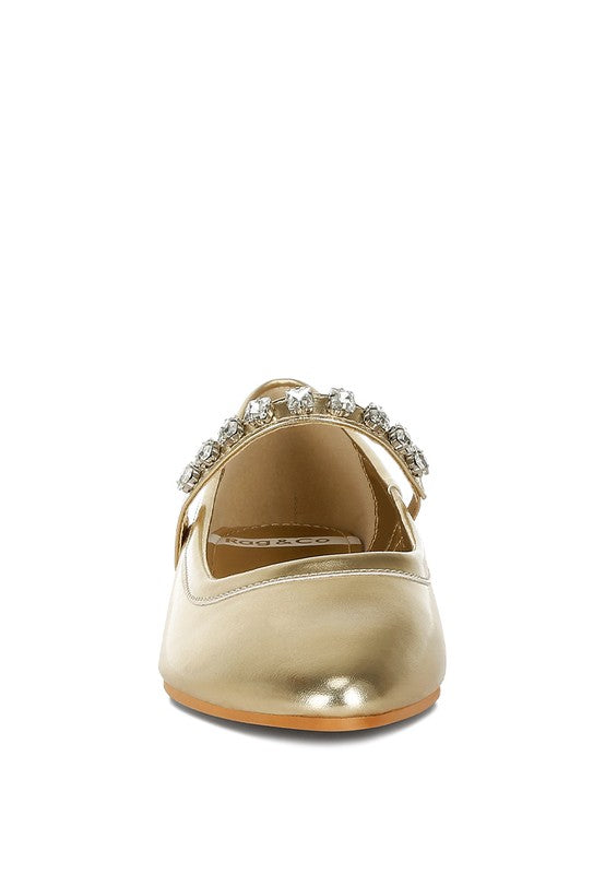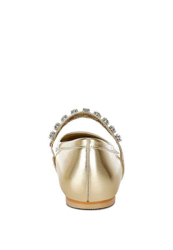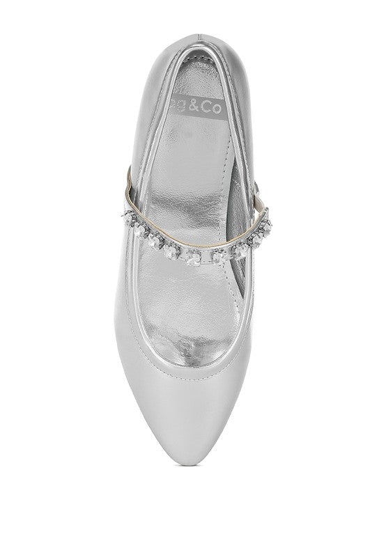 Type: Mary Jane Ballerinas Upper Material: Metallic Pleather Outer Sole: TPR Closed Pointed Toe Diamante Embellished Strap Comfortable Flat Heel Soft Cushion Insoles RCSH4970
