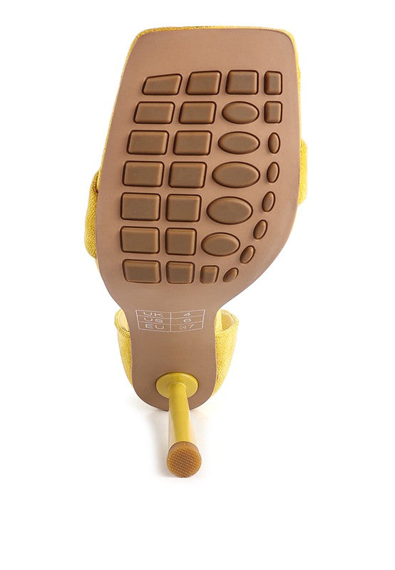 Thin high cylindrical heeled sandal in faux suede.Upper Material: Faux SuedeLining Material: PolyurethaneOuter sole: TPRSquare ToeBack Zipper OpeningMetallic Chain DetailLight Cushioning