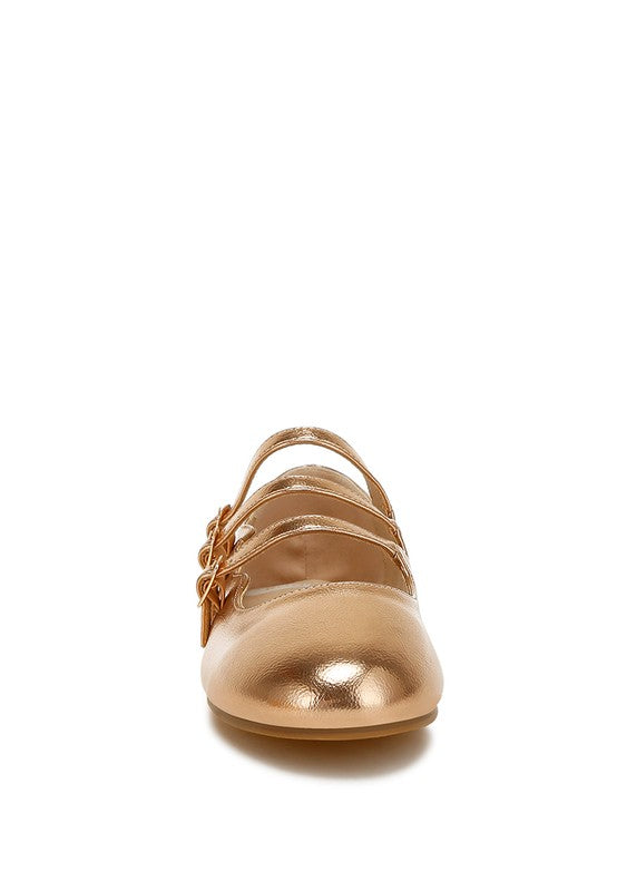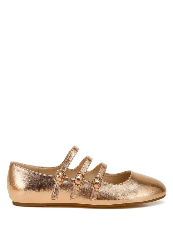 Type: Mary Jane Ballerinas Upper Material: Metallic Pleather Outer Sole: TPR Closed Round Toe Flat Heels Triple Pin Buckle Fastening Straps Comfortable Cushion Insoles RCSH4804