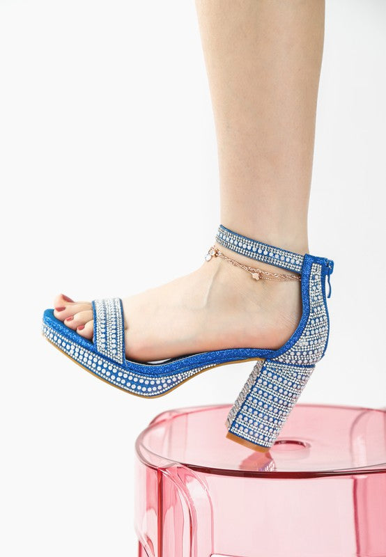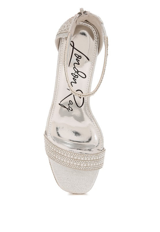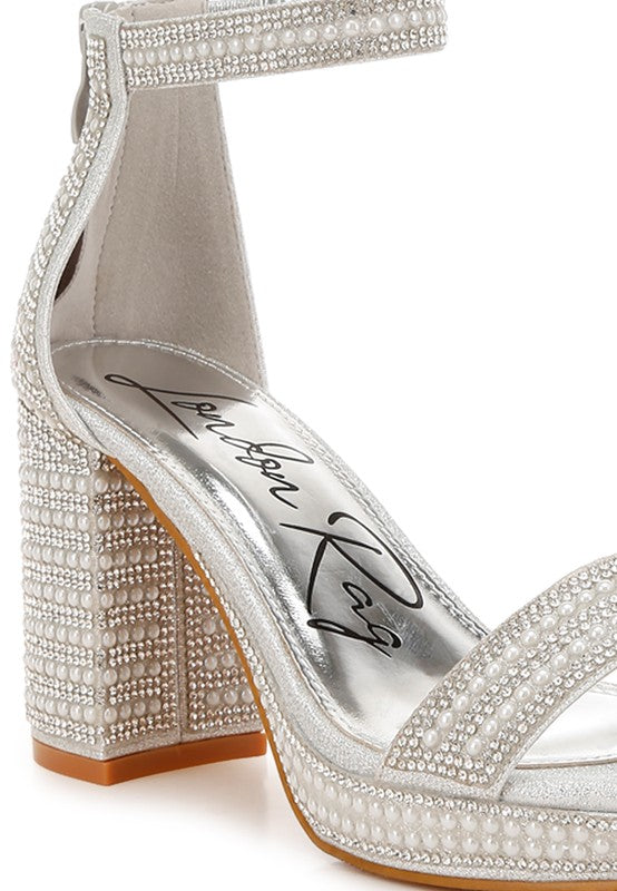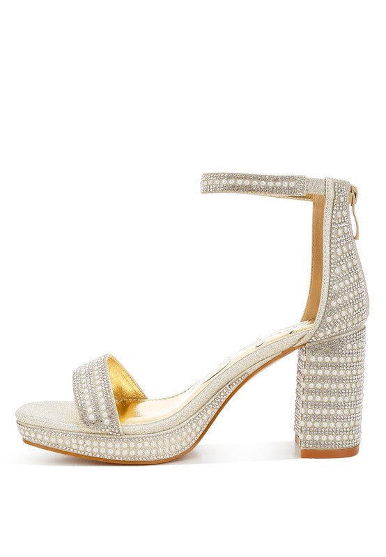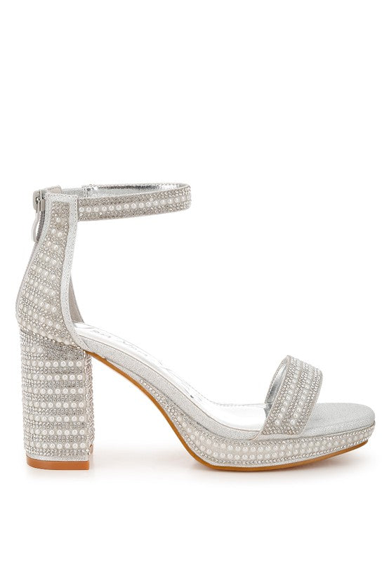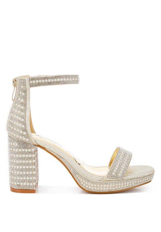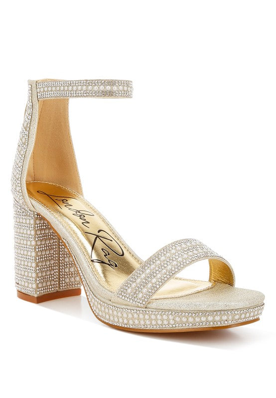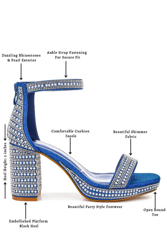 Maximalist magic! The rhinestones and pearls embellished sandals are simply stunning with the shimmer fabric. The comfortable cushion insole offers a relaxed fit while the ankle strap ensures a secure fit!Type: SandalsUpper Material: Shimmer FabricOuter Sole: RubberOpen Round ToePlatform Block HeelsRhinestones and Pearls EmbellishmentComfortable Cushion InsolesElasticated GussetsZipper ClosureHeel Height: 3 inchesSH4961