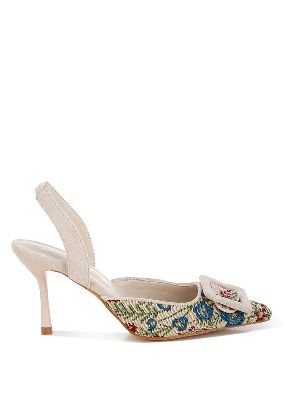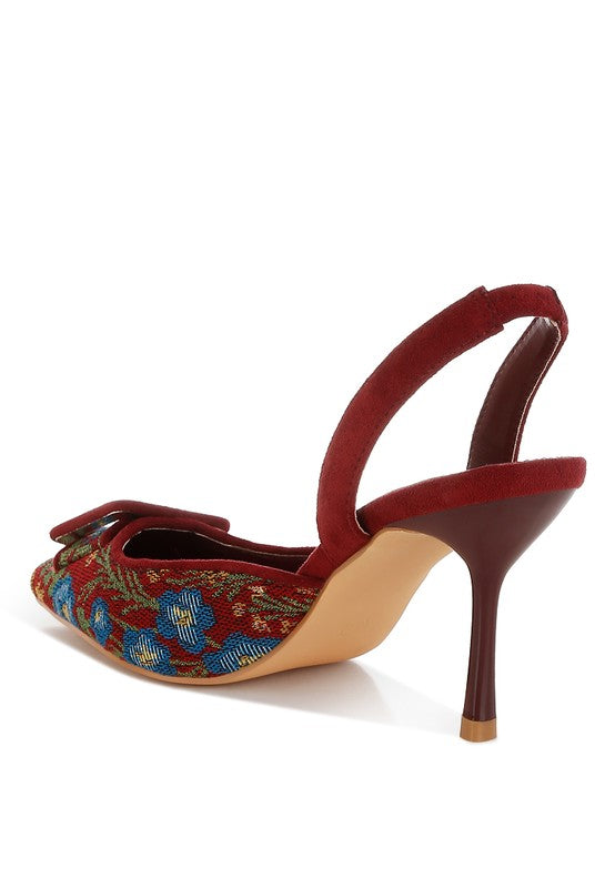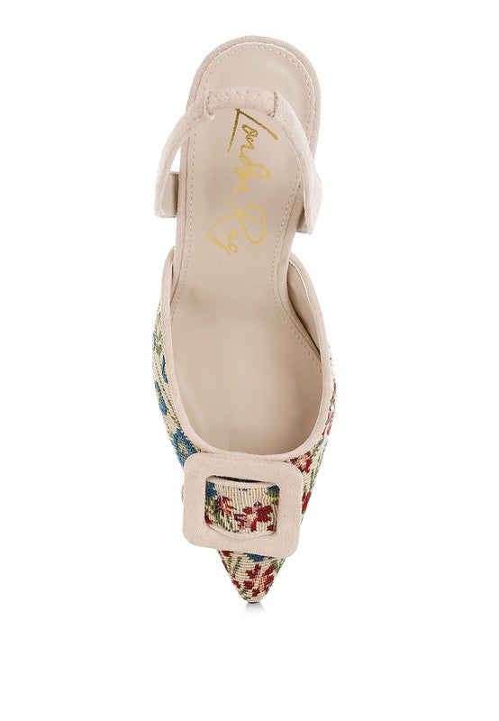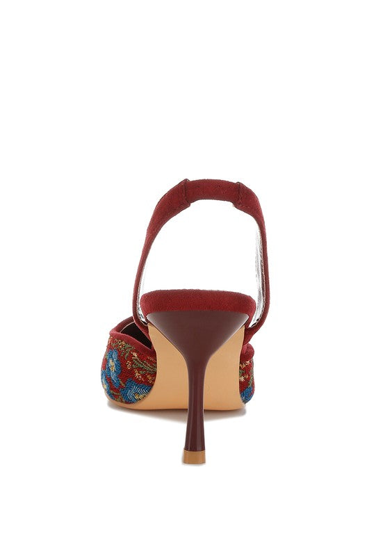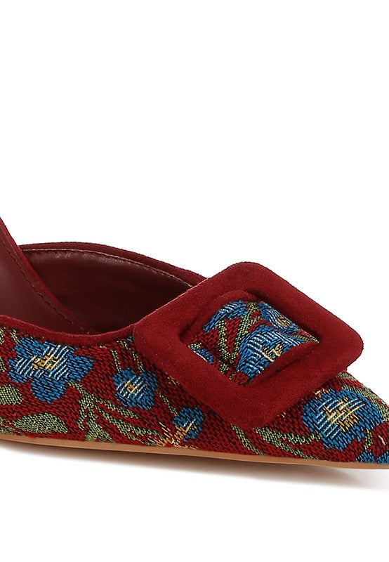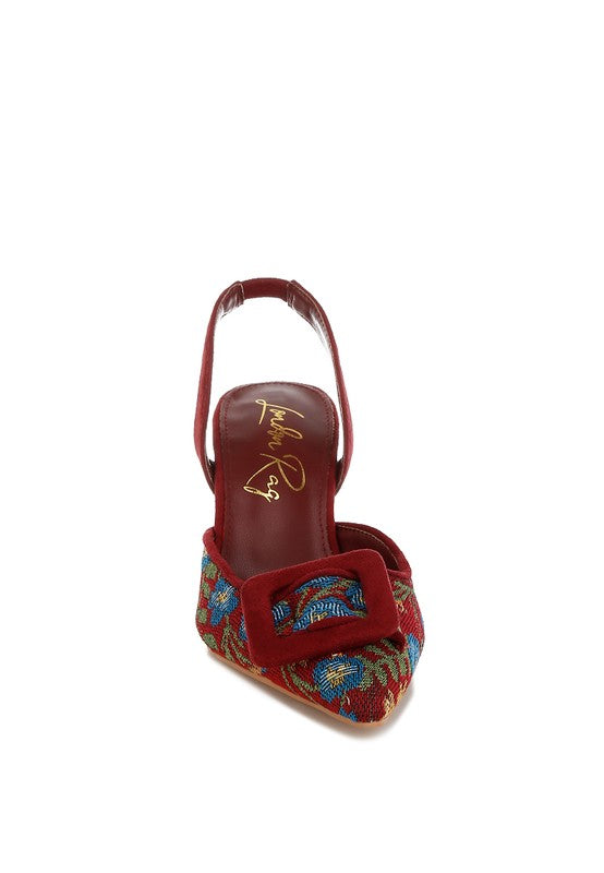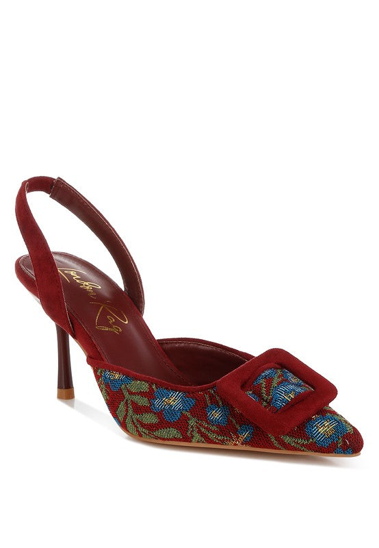 The moment you slip into these luxurious heel sandals, you'll never want to take them off! Designed with a stunning embroidered fabric for a delicate, refined look, they're elevated by the pointy toe, classic buckle detail and convenient slingback for added comfort.