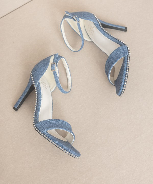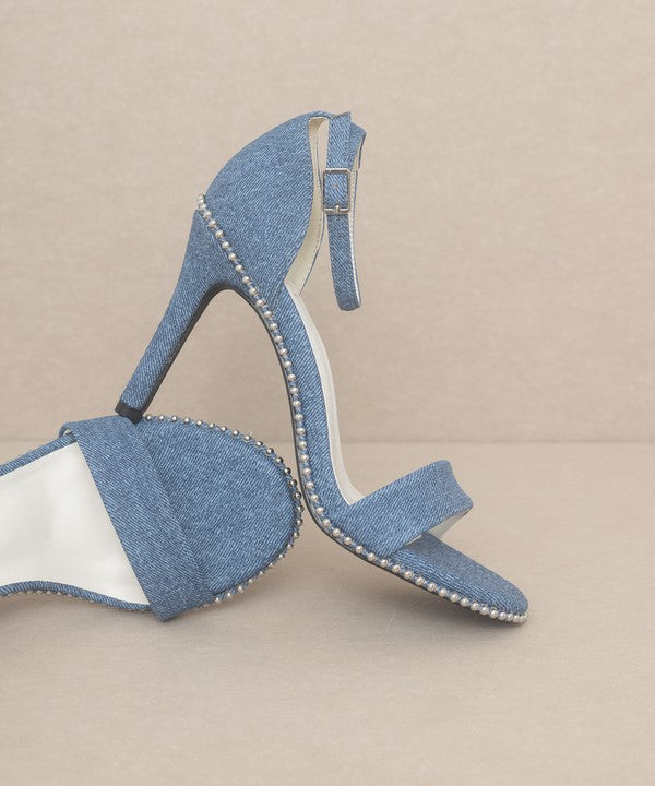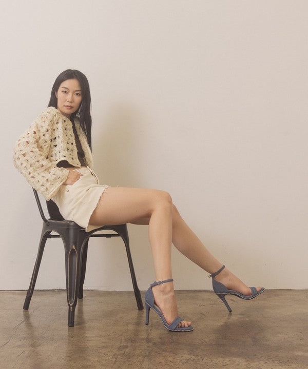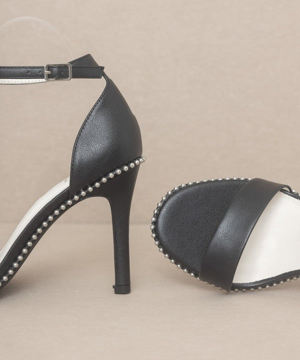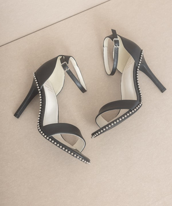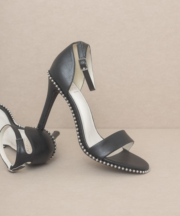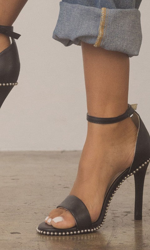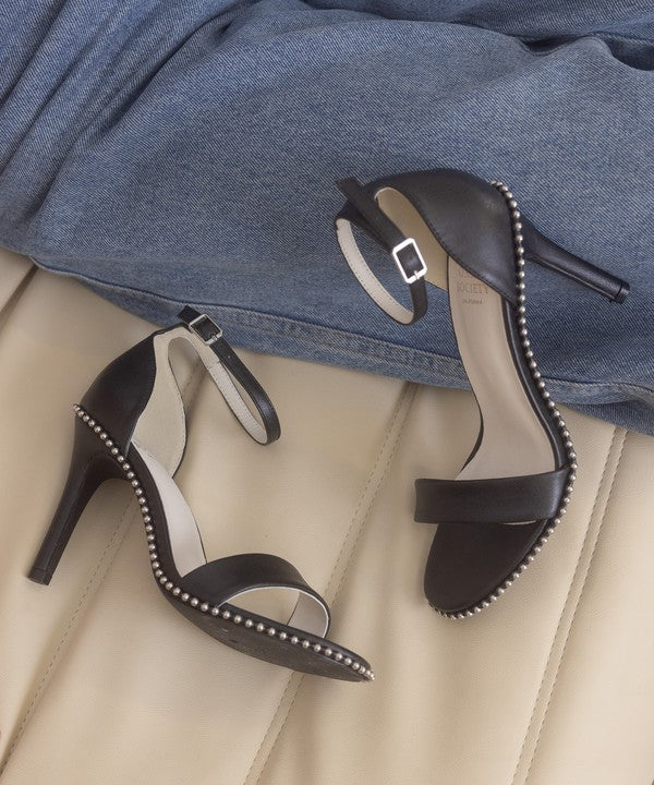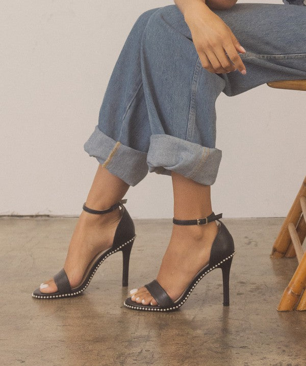 Introducing the Oasis Society Dublin - Metal Stud Open Toe Heels, a pair of heels that seamlessly blend edgy style with versatile appeal. These heels feature a metal drop stud wrapped heel, evoking strong 90s vibes that are both bold and fashionable.