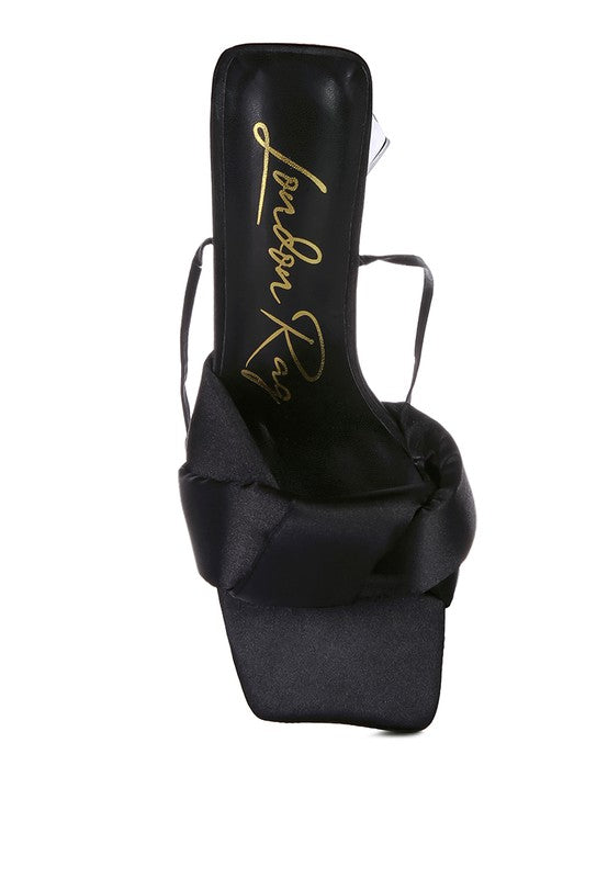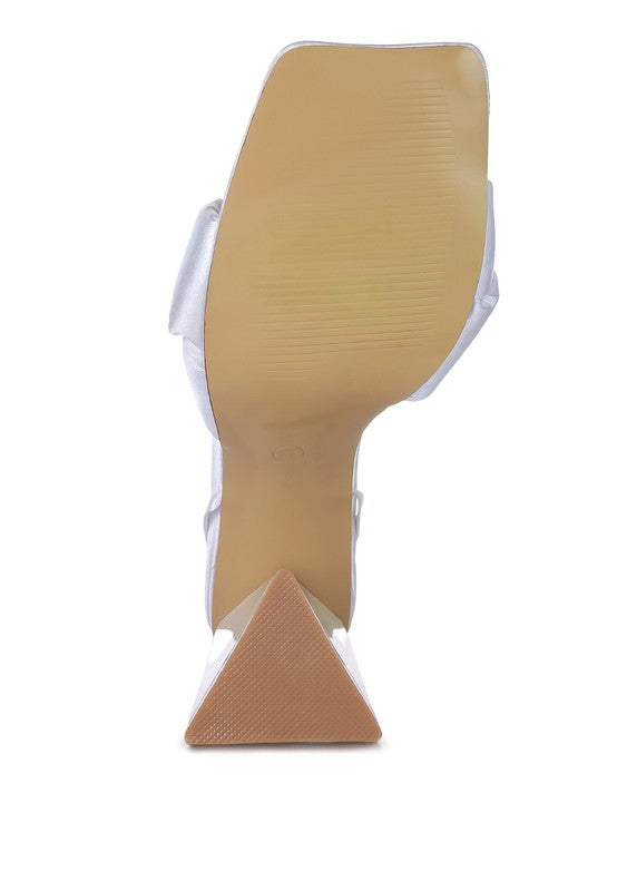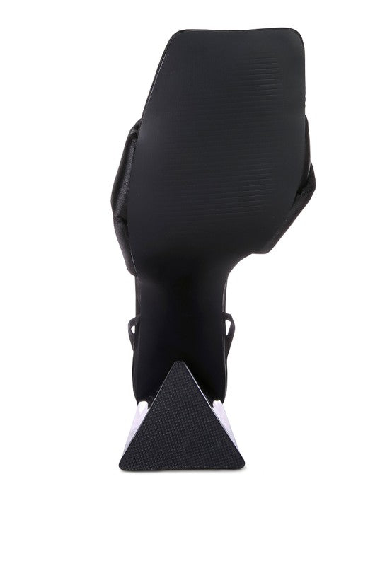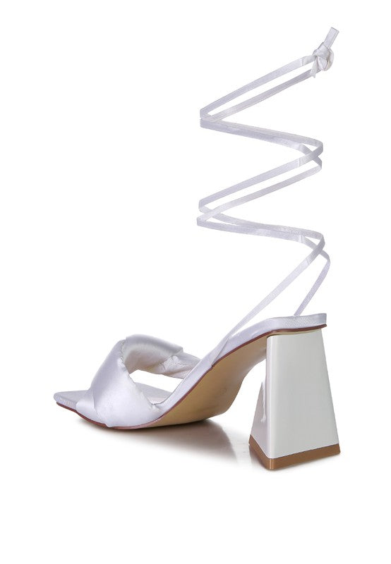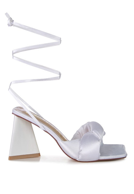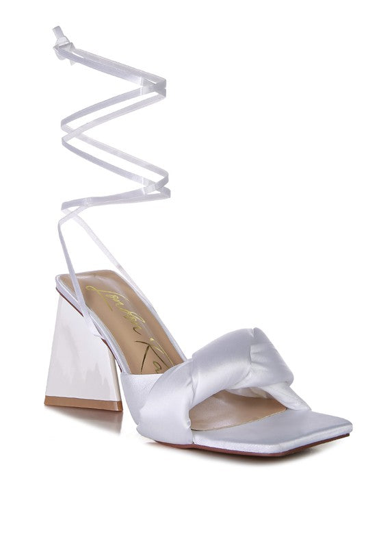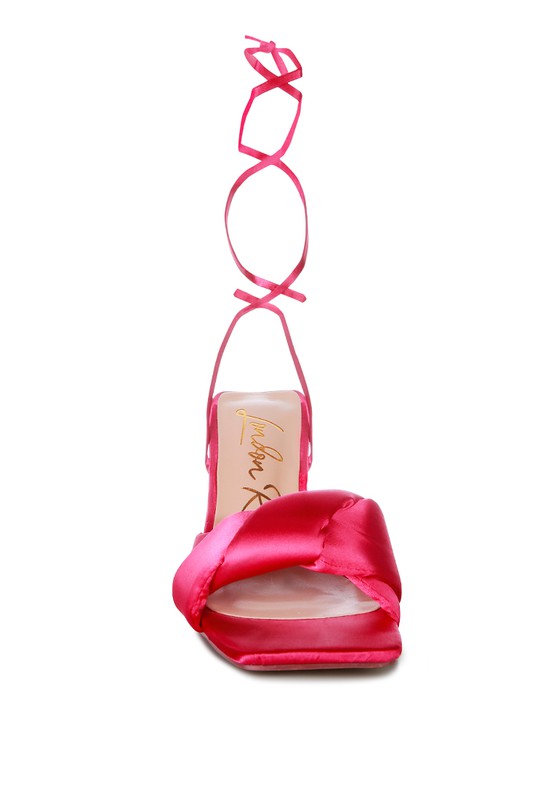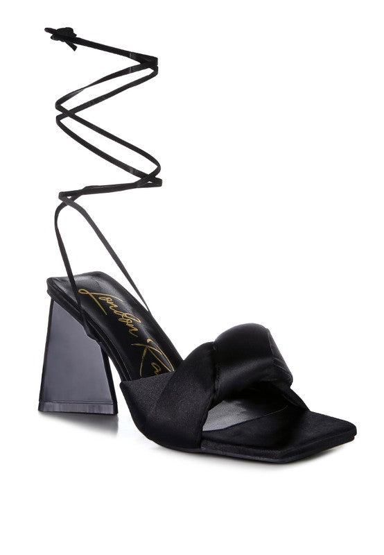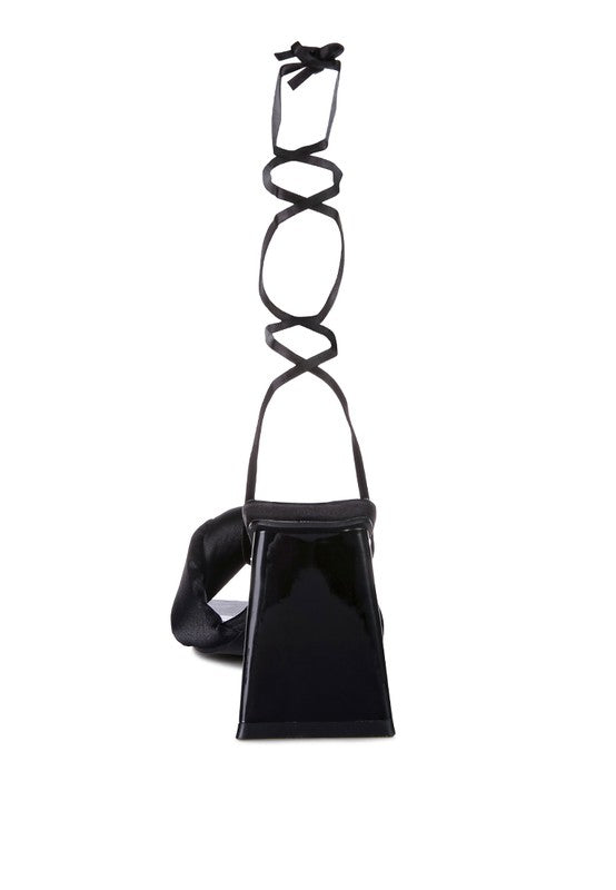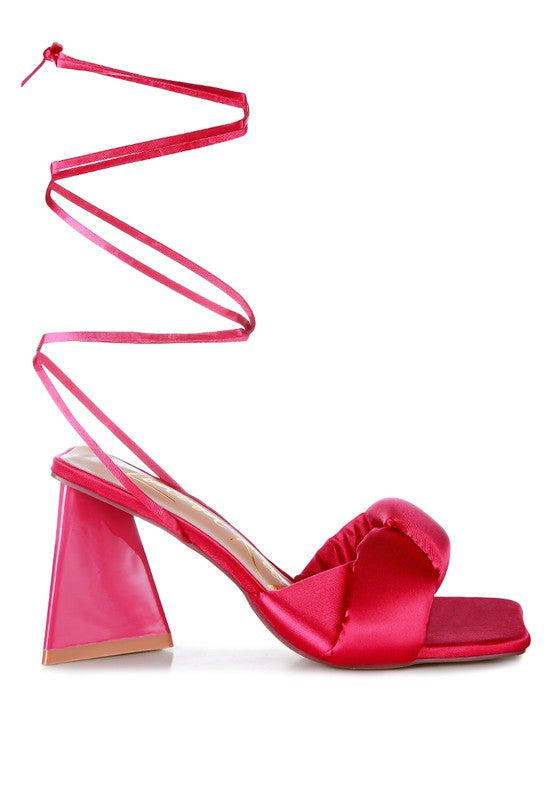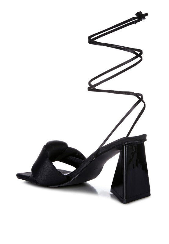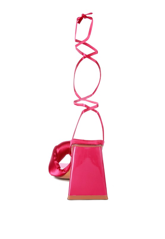Stuffed Satin Knotted strap sandal with interesting triangle block heel in shiny Patent PU is a party charmer. The high lace-up block heel sandal looks gorgeous on the feet and will be your favorite casual sandal in no time.
