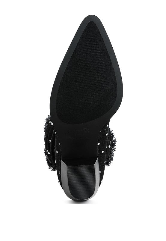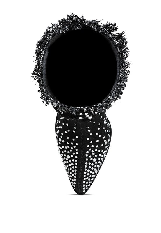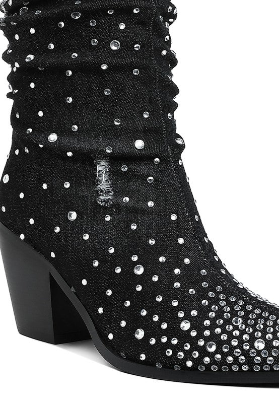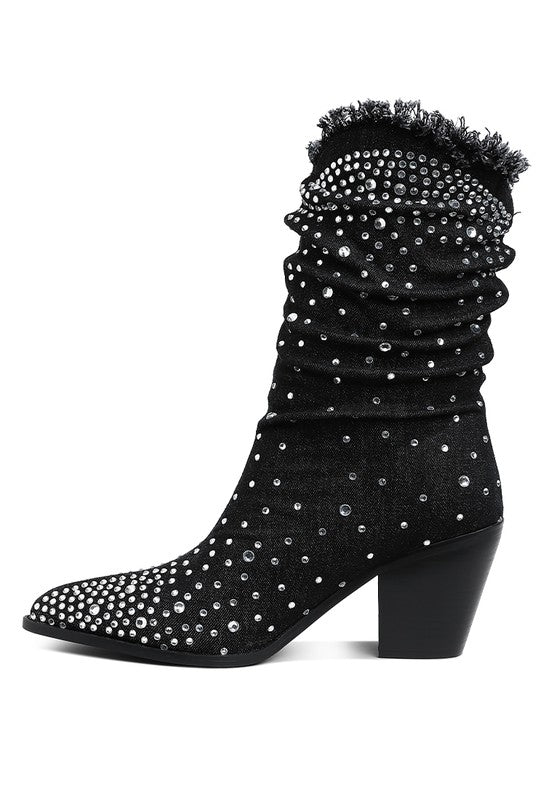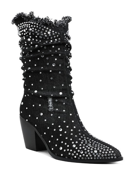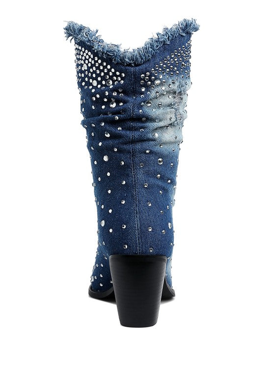 The denim boots are sure to be a showstopper with the dazzling rhinestones and diamante embellishments and the distressed detail. The slouchy detail gives it a unique silhouette as well with the subtle Western aesthetic. The boots have block heels and soft insoles which offer a relaxed fit.