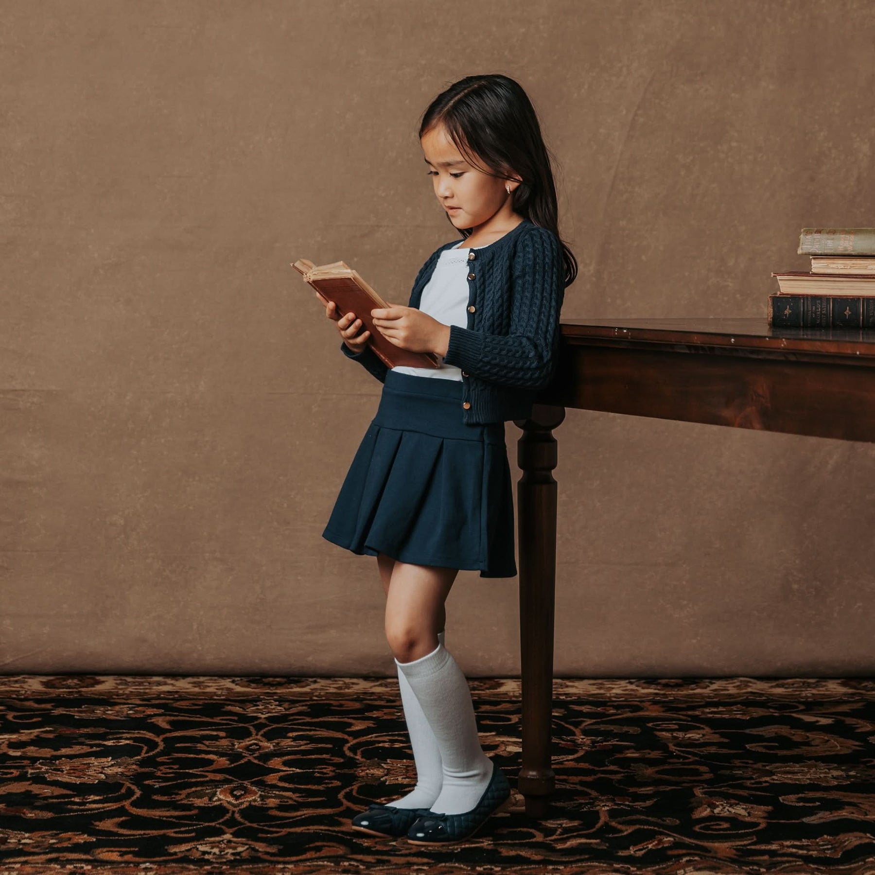 Our adorable classic cable cardigan in soft organic cotton is a sophisticated wardrobe staple for your little lady. This is the piece that layers perfectly with anything from a dressy dress, to a school uniform, to t-shirt and jeans! Features gold shank buttons at the center front and two sweet little pockets.