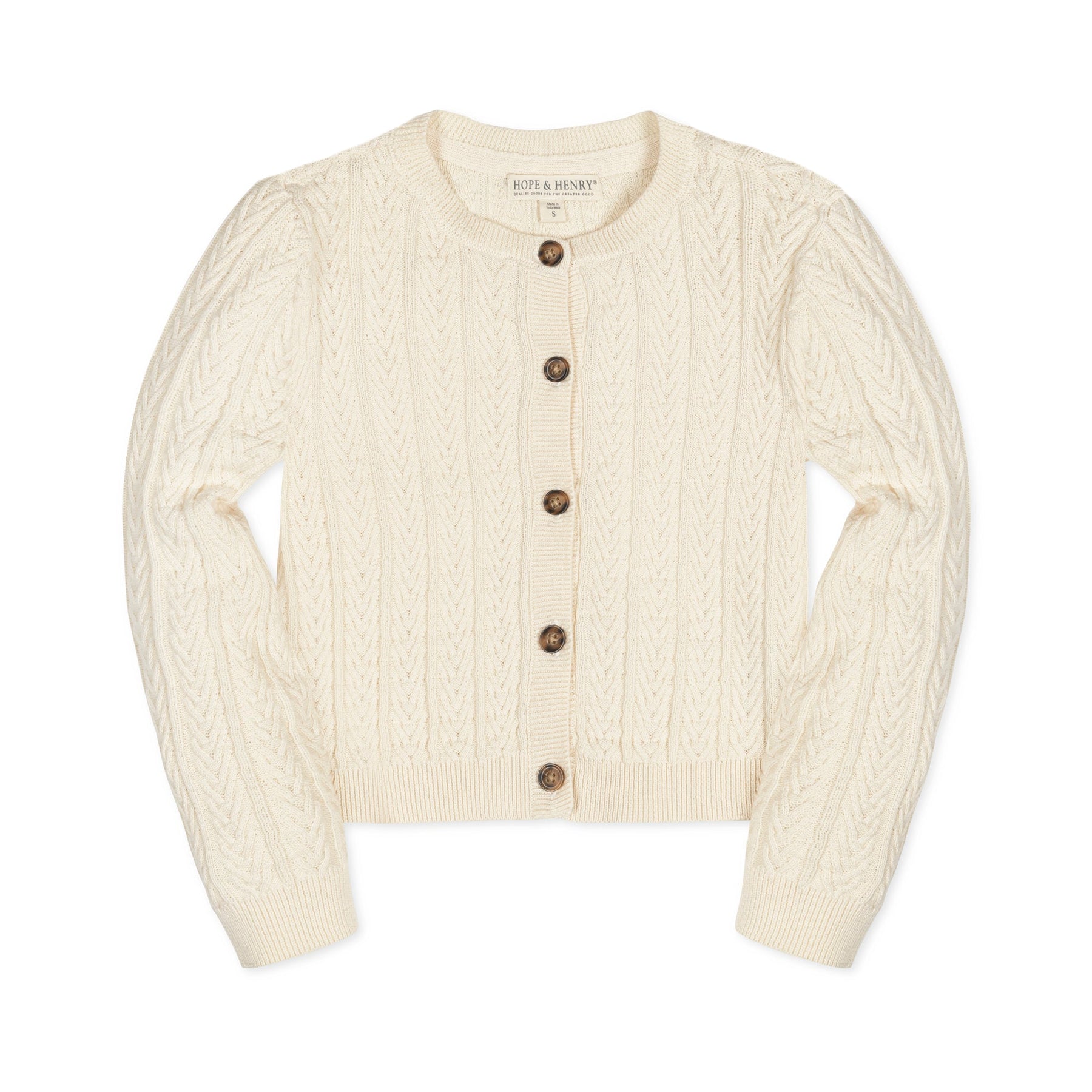 Our adorable cable cardigan in soft organic cotton is a sophisticated wardrobe staple for when you need a little extra coverage. This piece layers beautifully with anything from a dressy dress to a tee with jeans! Features faux horn buttons at the center front and an elevated chevron cable knit design throughout.