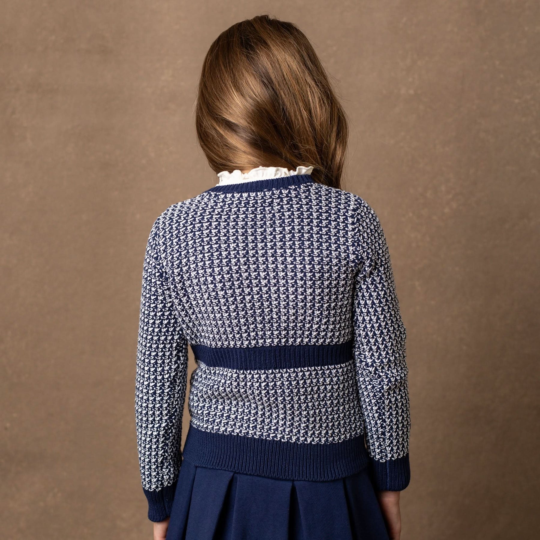 Our sophisticated sweater cardigan in soft organic cotton is elevated by a beautiful tweed-like stitch. Features gold buttons, front patch pockets, contrast trim, and a sweet bow detail at the waist. This piece pairs perfectly with our collection of organic cotton knit tops and skirts for a polished look.