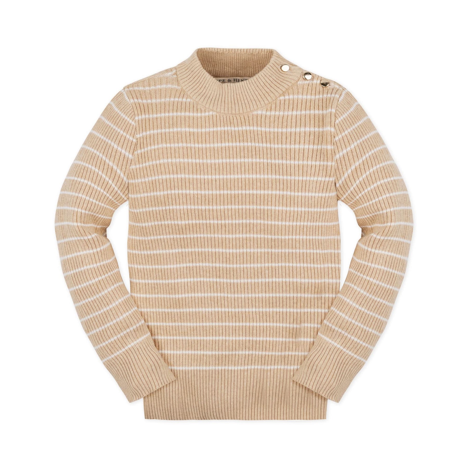 Our refined long sleeve mock neck sweater in soft organic cotton gives your girl the sophisticated style she needs this fall and winter season. Features a subtle mock neck with gold button detail, delicate striping, and rib knit trim. Looks perfectly chic paired with our assortment of organic cotton skirts, jumpers, and leggings!