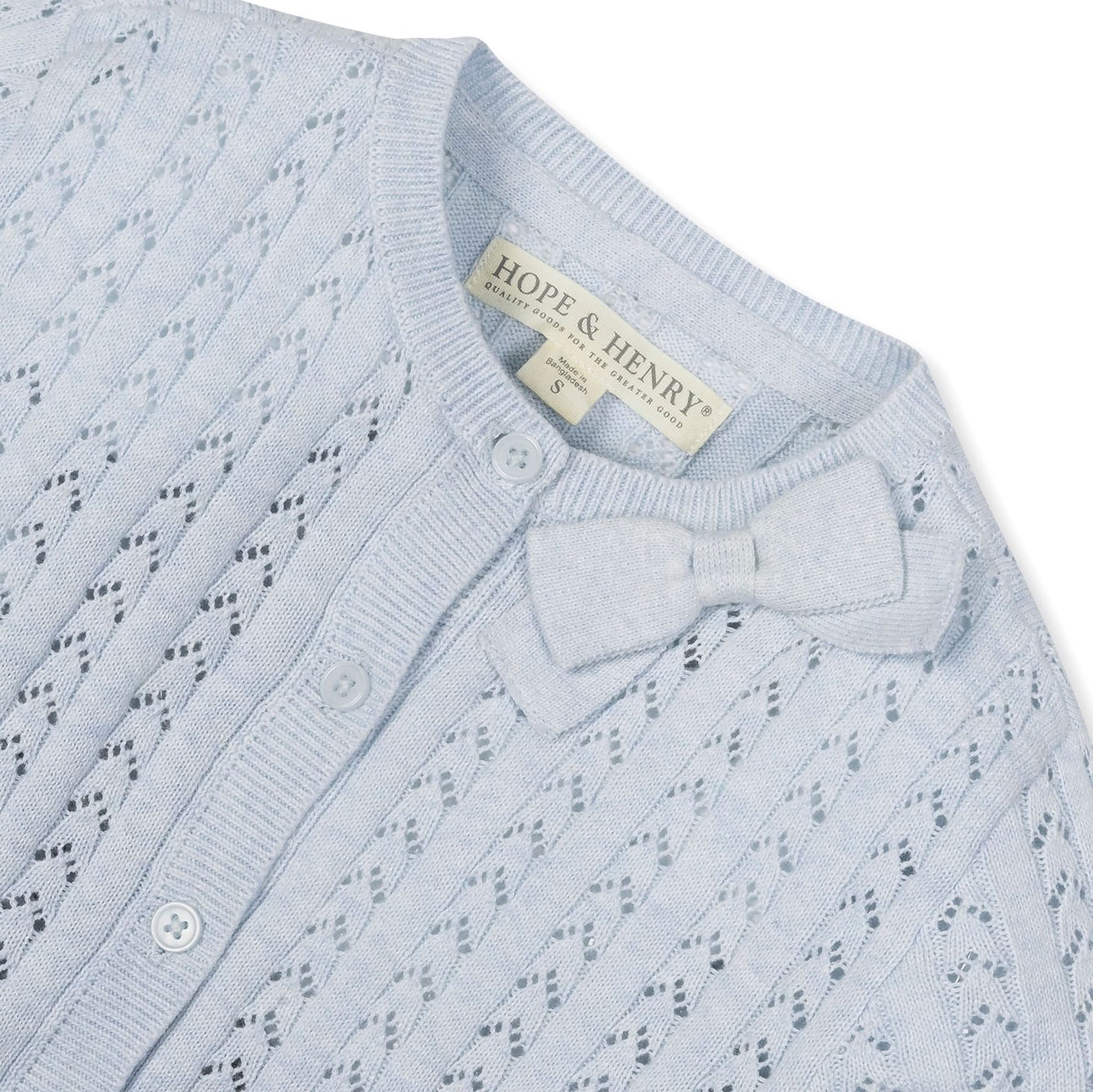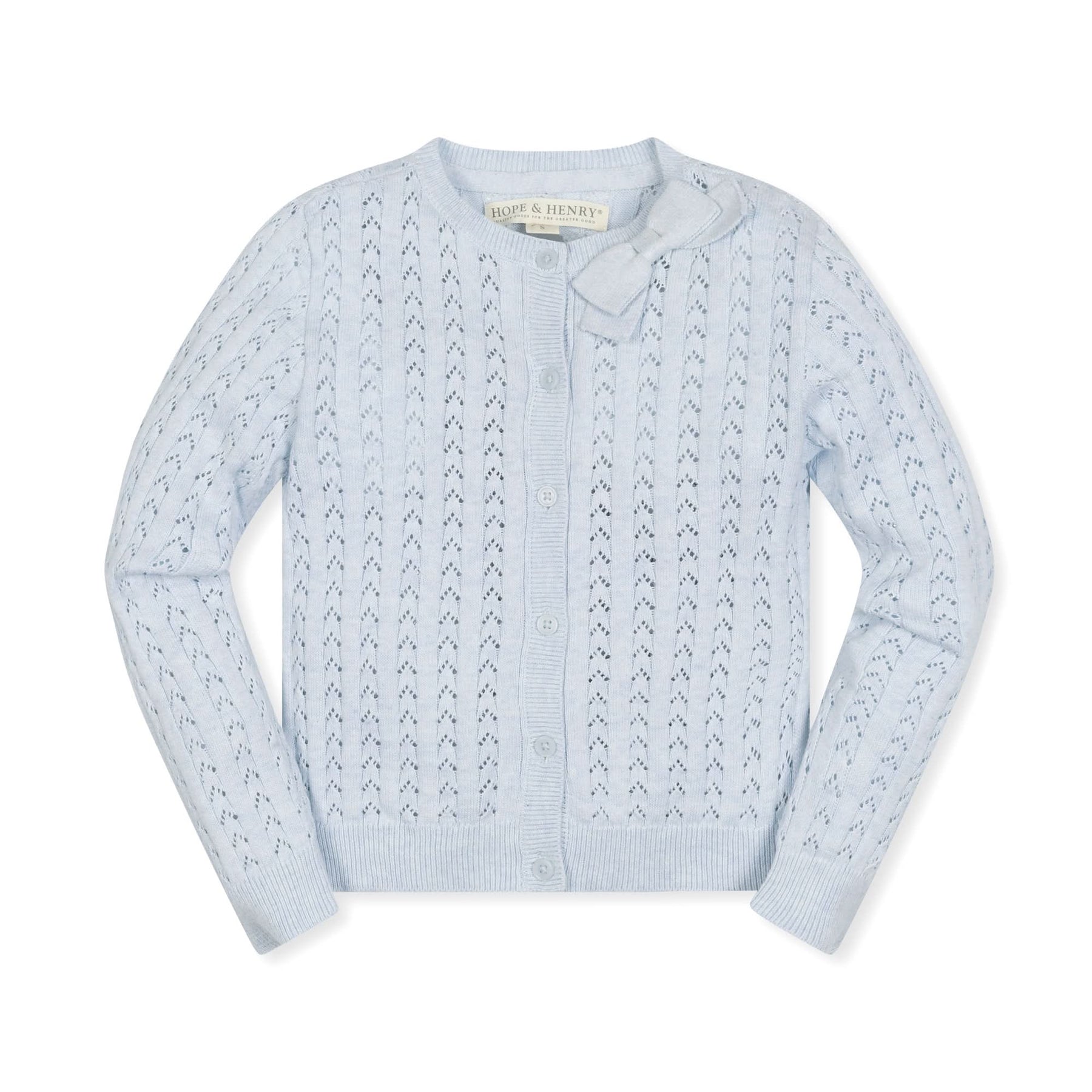 A classic cardigan silhouette in soft organic cotton feels oh-so-special thanks to a combo of sweet pointelle knit and a bow detail at the collar. Features a button front closure. A beautiful layering piece for all of spring and summer's special occasions.