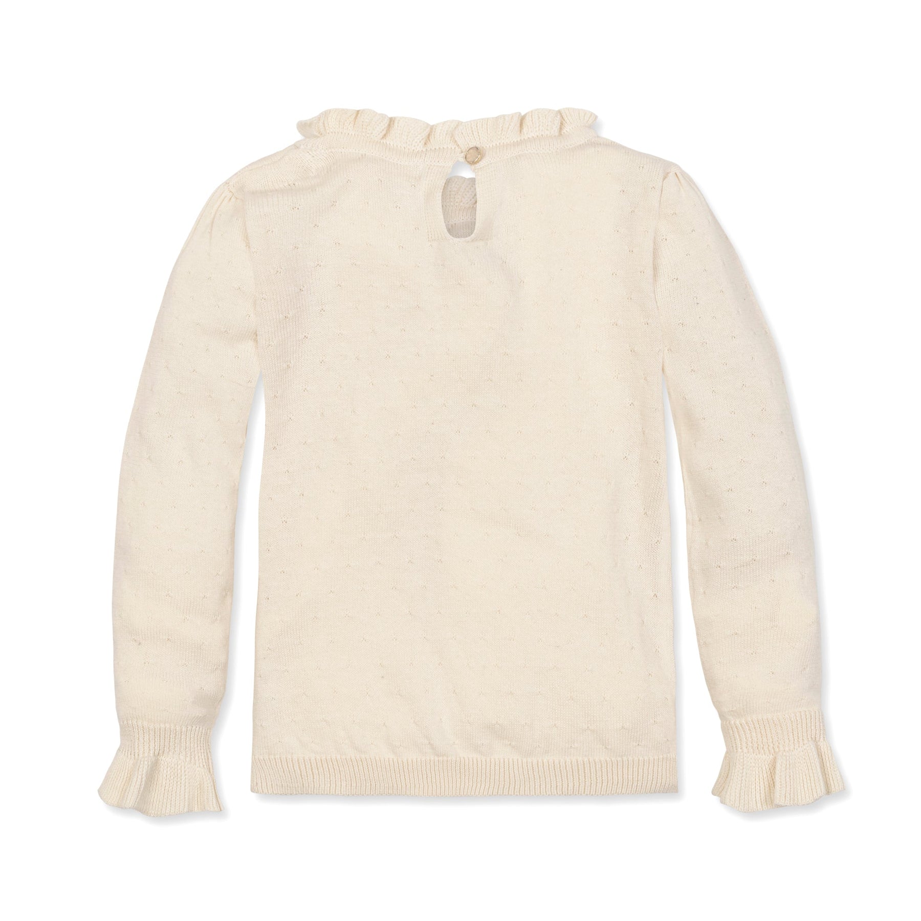 A pretty sweater for fall crafted from soft organic cotton. Features a delicate knit texture, ruffled edges at the collar and cuffs, and a back keyhole closure with gold button for easy dressing. We love this piece paired with one of our organic cotton blazers and skirts for an adorable look.