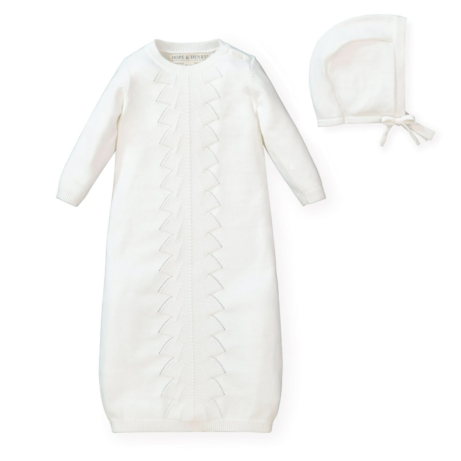 Little ones will love the feel of this soft organic cotton sweater gown with matching knit bonnet. Features a beautiful pointelle stitch down the center and a bottom opening that makes changes super easy for baby. A perfect shower gift or special occasion outfit!