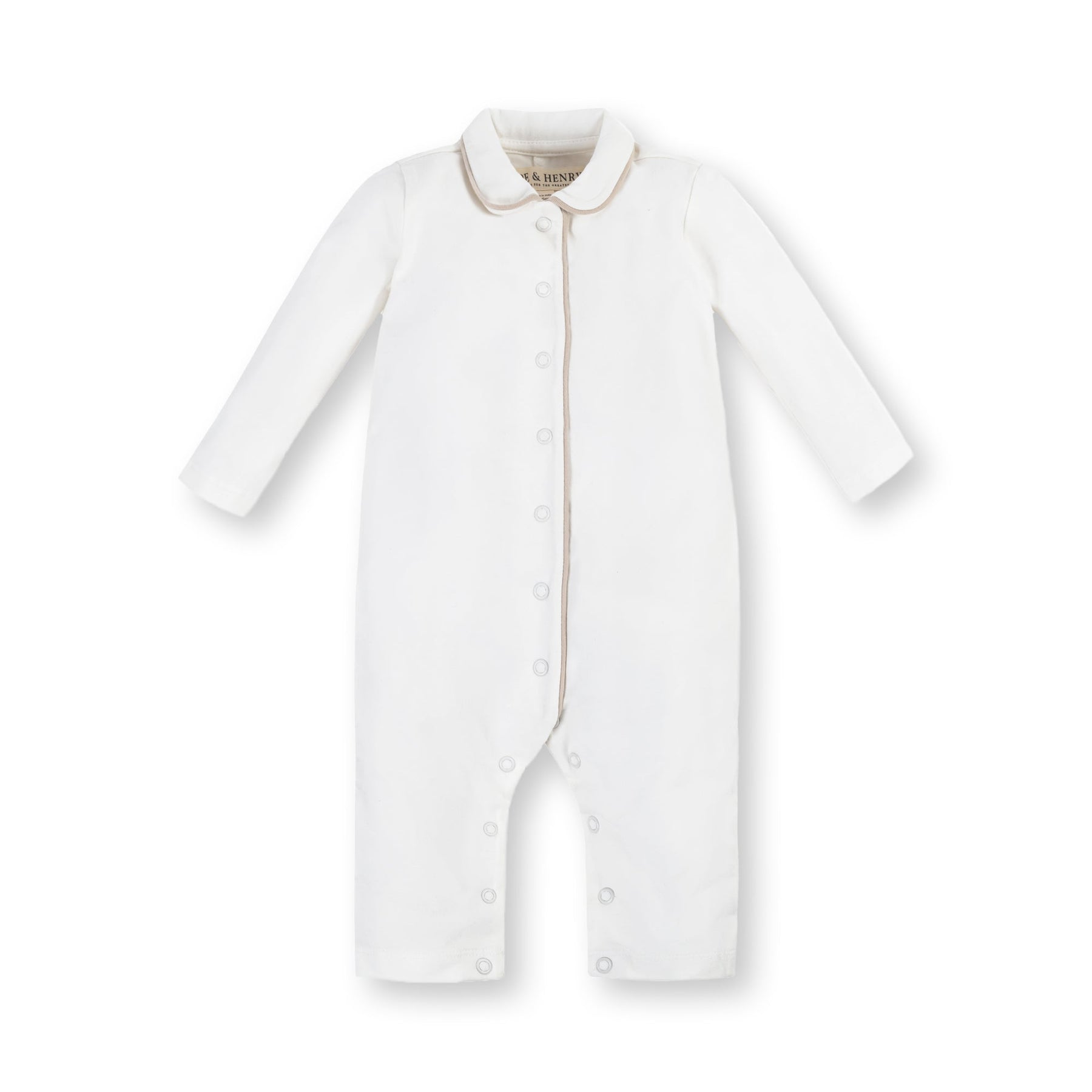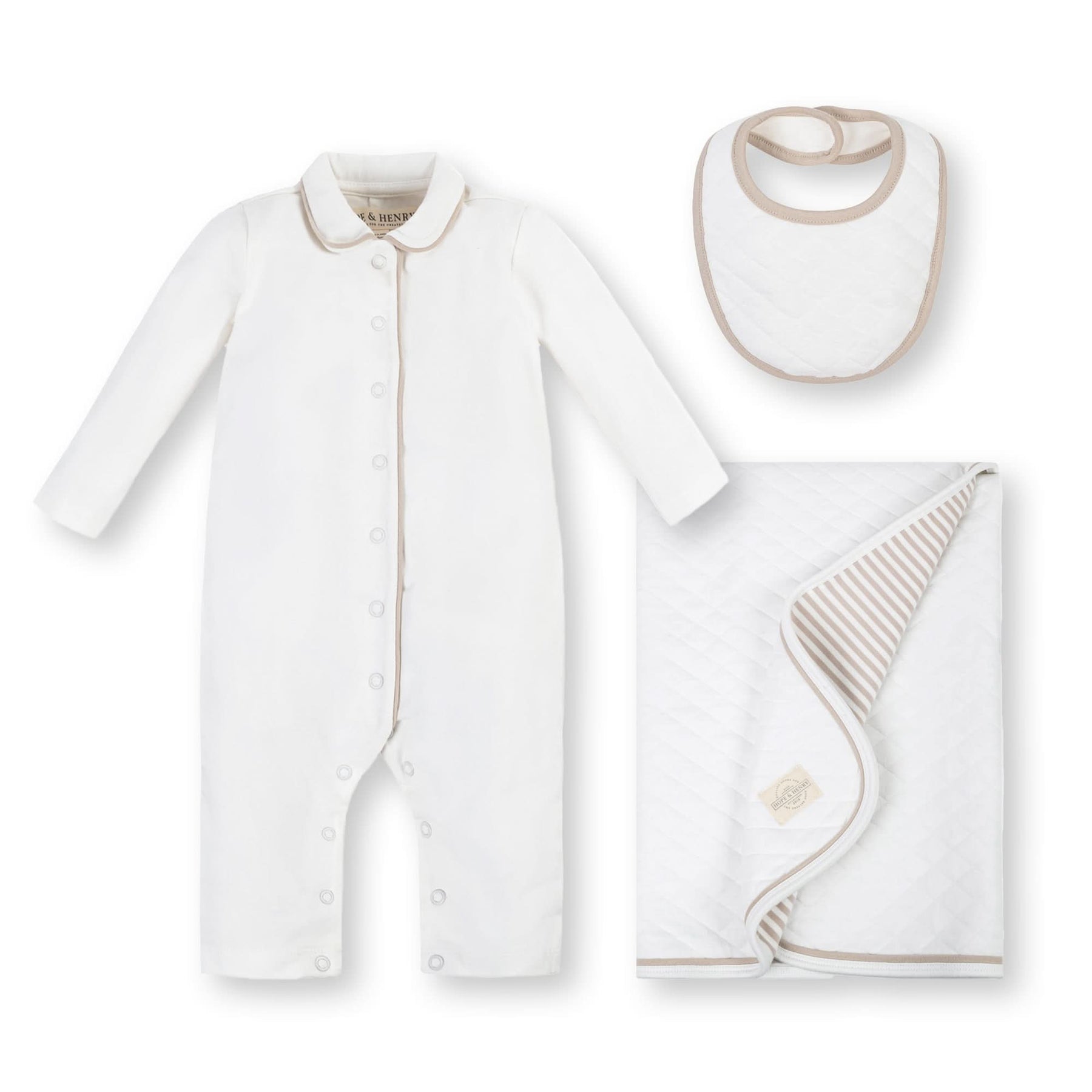 Our adorable 3-piece gift set is the perfect gift for a sweet baby boy or girl! Features a soft organic cotton long sleeve romper with a peter pan collar and snap closure down the center front and legs. Also includes a matching beanie, bib, and a diamond quilted organic cotton blanket. Packaged in a soft coordinating drawstring bag for gift-giving or storage.