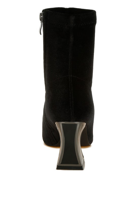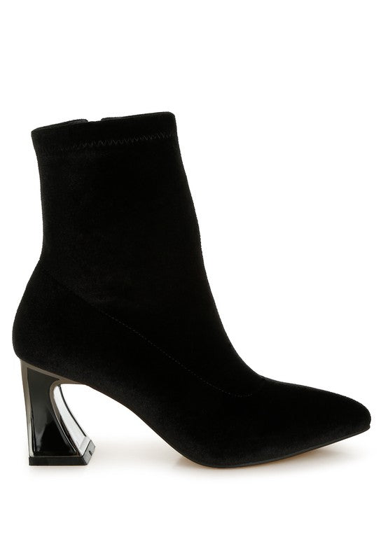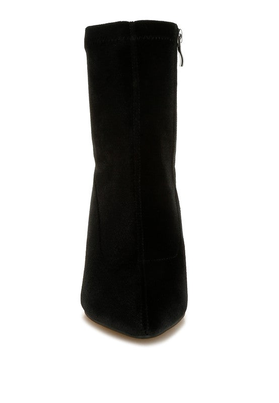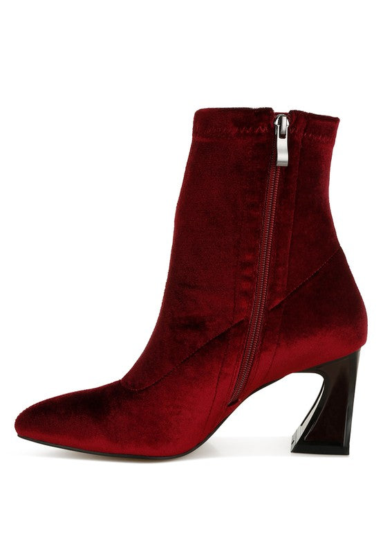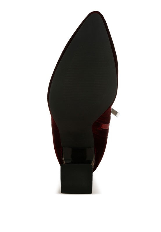 The boots have a luscious aura with the beautiful velvet upper and the flared block heel which adds a trendy and stylish touch to the whole shoe construction. The soft cushion insoles cut strain and offer a comfortable fit.Type: BootsUpper Material: VelvetOuter Sole: TPRClosed Pointed ToeFlared Block HeelsPaneling DetailZipper ClosureComfortable Cushion InsolesHeel Height: 3 inchesSH5240