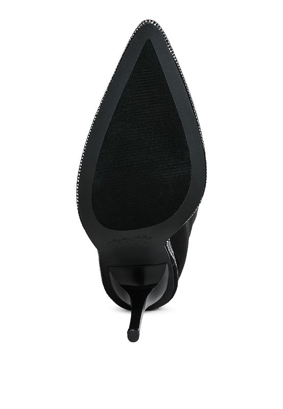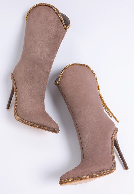 The stiletto boots have a romantic charm with the single diamante embellished chain detail and subtle rhinestones embellished frame. The microfiber boots have a matte finish and have a subtle minimalist beauty which is chic. The comfortable cushion insole cut strain and offer a relaxed fit.