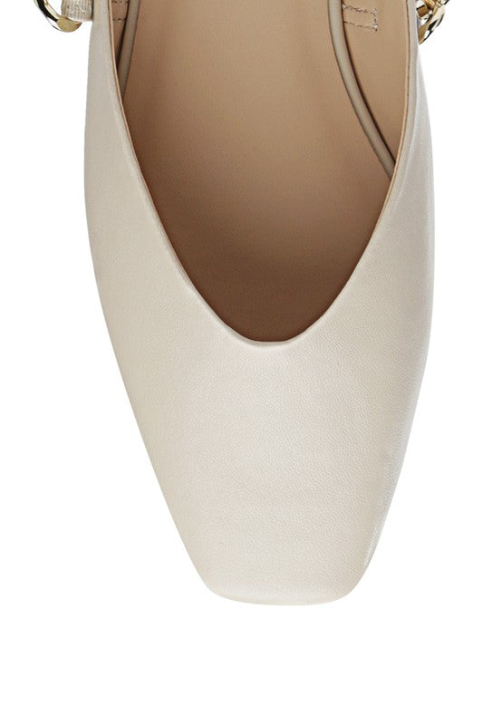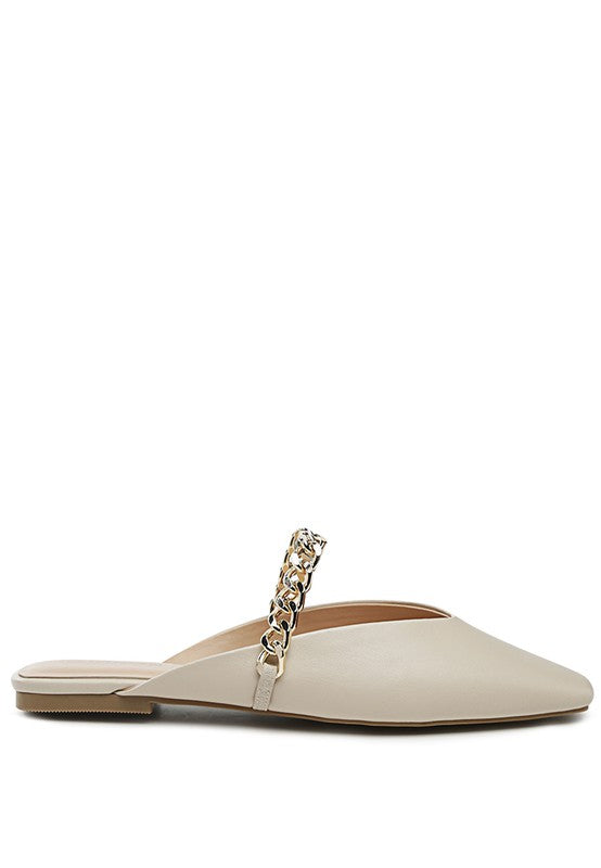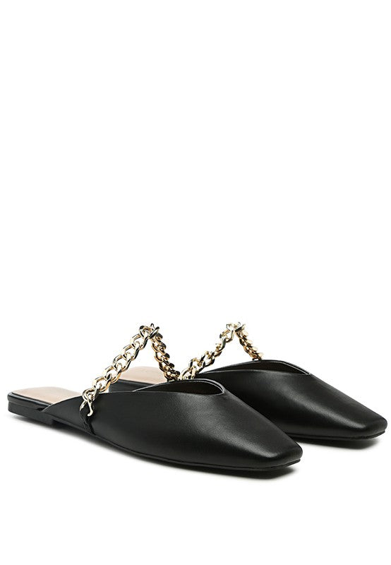 Beautiful pair of flats the ballerina styled shoe comes with shiny metal chain strap.Style note: Square cut on the tip, absolutely in vogue. Stay light and glide through your way in these uber comfy stylish flat shoes.Type: Slip-OnHeel Type: FlatPoints: Flat Shoe in a Beautiful FinishMetal Chain StrapUpper Material: PolyurethaneLining Material: PolyurethaneOuter Sole: TPRPointed Square Cut ToeGreat FitCasual ShoeComfortable, DurableSH2429